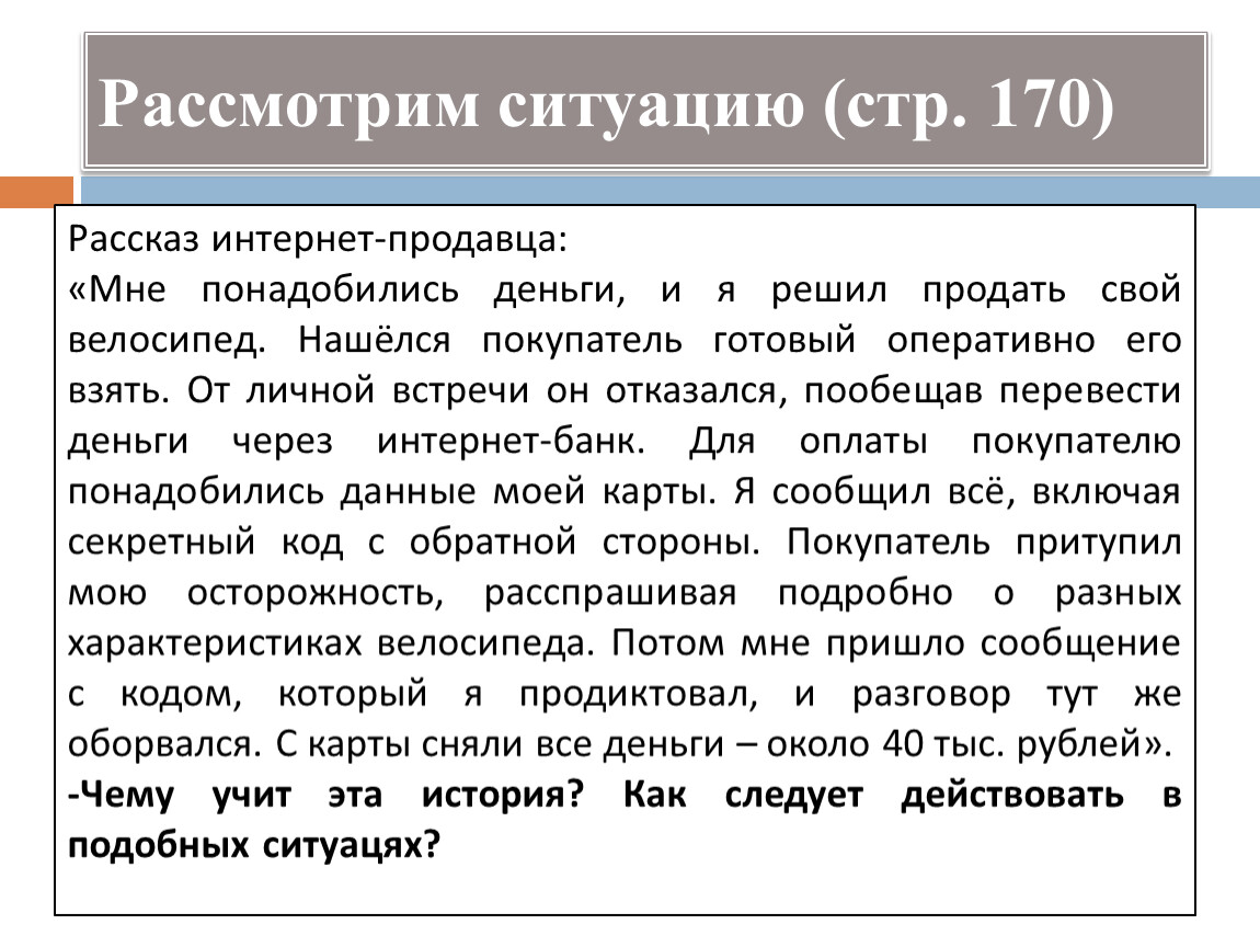«Мне понадобились деньги, и я решил продать свой велосипед. Нашёлся покупатель готовый оперативно его взять. От личной встречи он отказался, пообещав перевести деньги через интернет-банк. Для оплаты покупателю понадобились данные моей карты. Я сообщил всё, включая секретный код с обратной стороны. Покупатель притупил мою осторожность, расспрашивая подробно о разных характеристиках велосипеда. Потом мне пришло сообщение с кодом, который я продиктовал, и разговор тут же оборвался. С карты сняли все деньги – около 40 тыс. рублей».