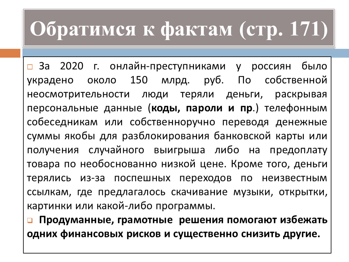 За 2020 г. онлайн-преступниками у россиян было украдено около 150 млрд. руб. По собственной неосмотрительности люди теряли деньги, раскрывая персональные данные (коды, пароли и пр.) телефонным собеседникам или собственноручно переводя денежные суммы якобы для разблокирования банковской карты или получения случайного выигрыша либо на предоплату товара по необоснованно низкой цене. Кроме того, деньги терялись из-за поспешных переходов по неизвестным ссылкам, где предлагалось скачивание музыки, открытки, картинки или какой-либо программы.