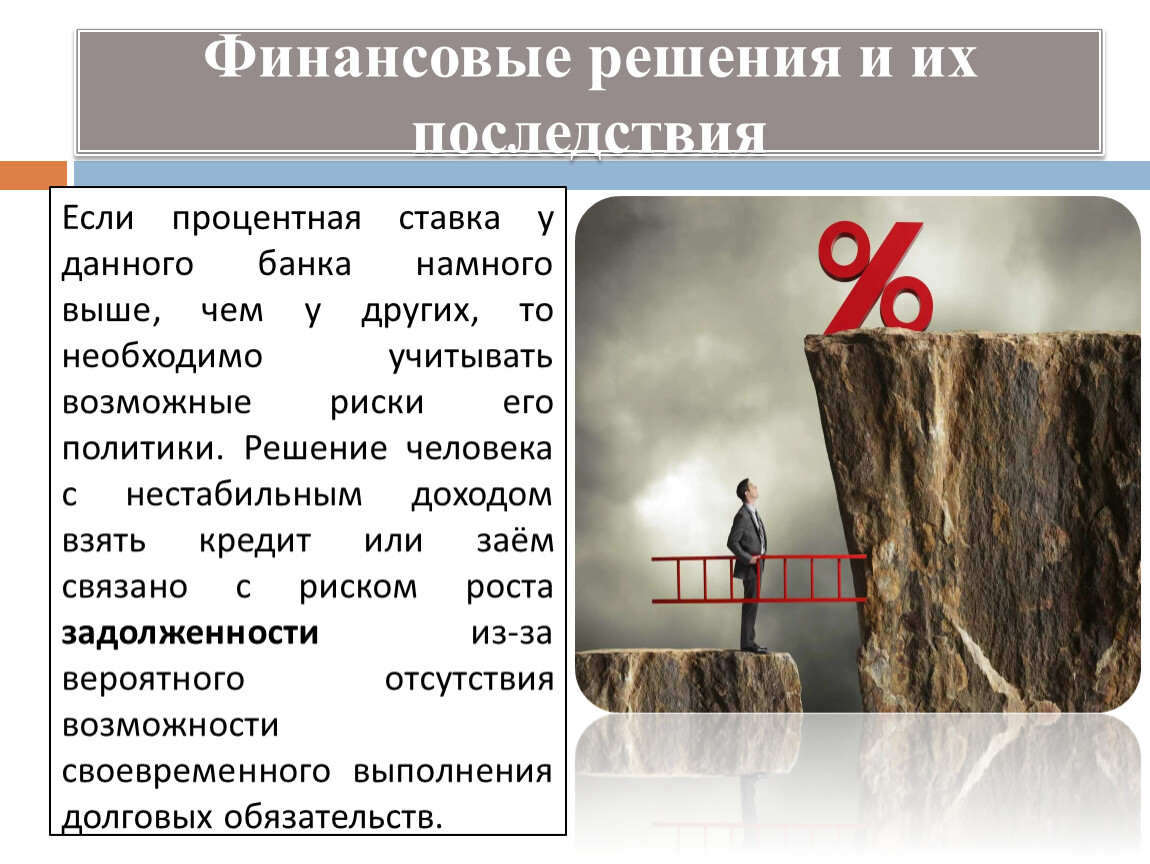 Если процентная ставка у данного банка намного выше, чем у других, то необходимо учитывать возможные риски его политики. Решение человека с нестабильным доходом взять кредит или заём связано с риском роста задолженности из-за вероятного отсутствия возможности своевременного выполнения долговых обязательств.