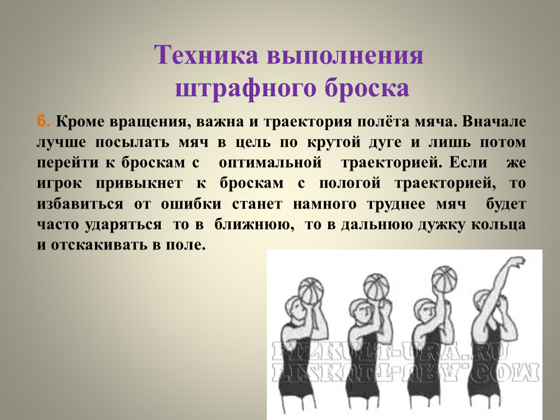 6. Кроме вращения, важна и траектория полёта мяча. Вначале лучше посылать мяч в цель по крутой дуге и лишь потом перейти к броскам с оптимальной траекторией. Если же игрок привыкнет к броскам с пологой траекторией, то избавиться от ошибки станет намного труднее мяч будет часто ударяться то в ближнюю, то в дальнюю дужку кольца и отскакивать в поле.