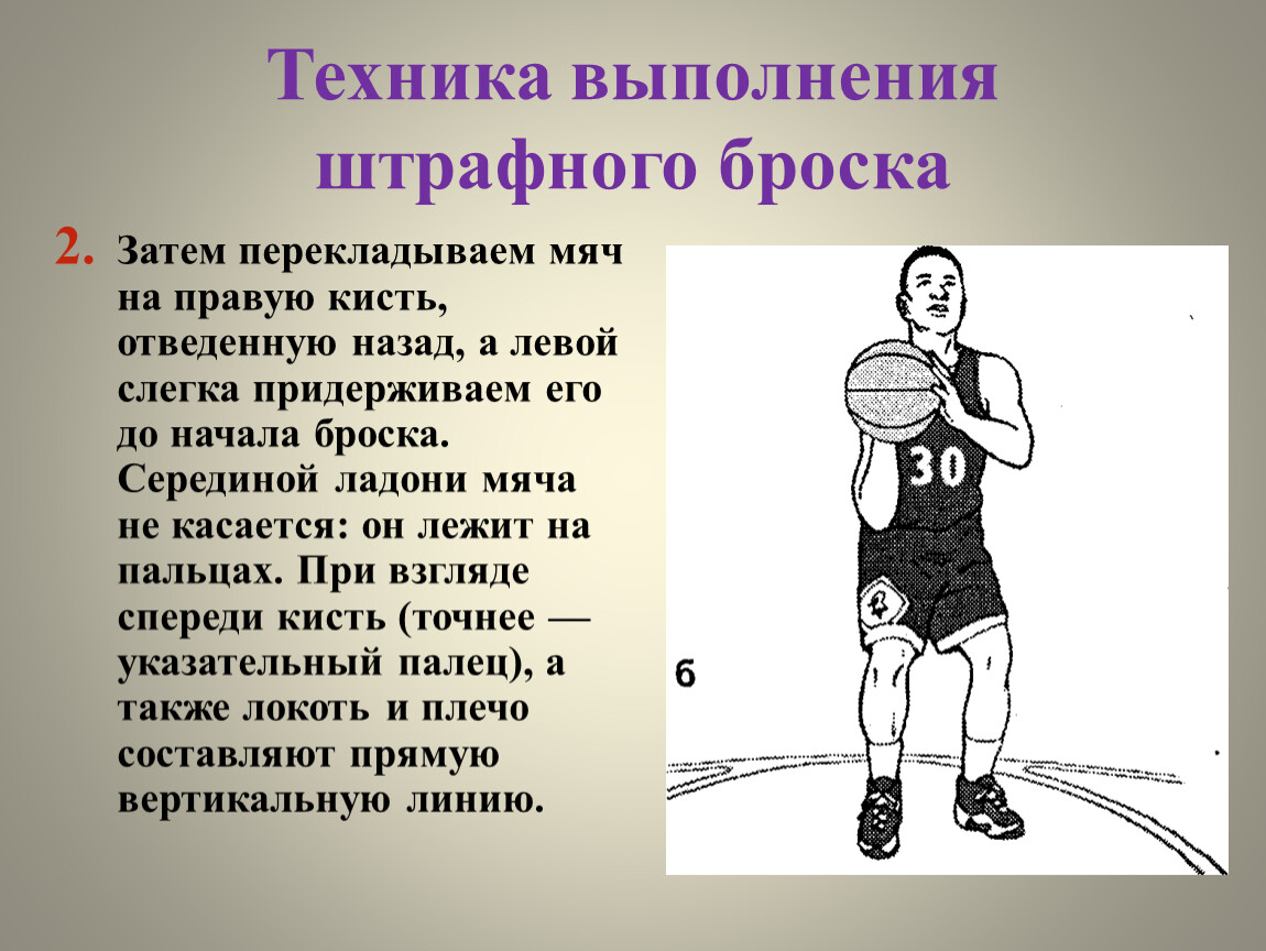 Затем перекладываем мяч на правую кисть, отведенную назад, а левой слегка придерживаем его до начала броска. Серединой ладони мяча не касается: он лежит на пальцах. При взгляде спереди кисть (точнее — указательный палец), а также локоть и плечо составляют прямую вертикальную линию.