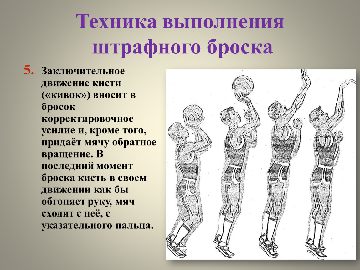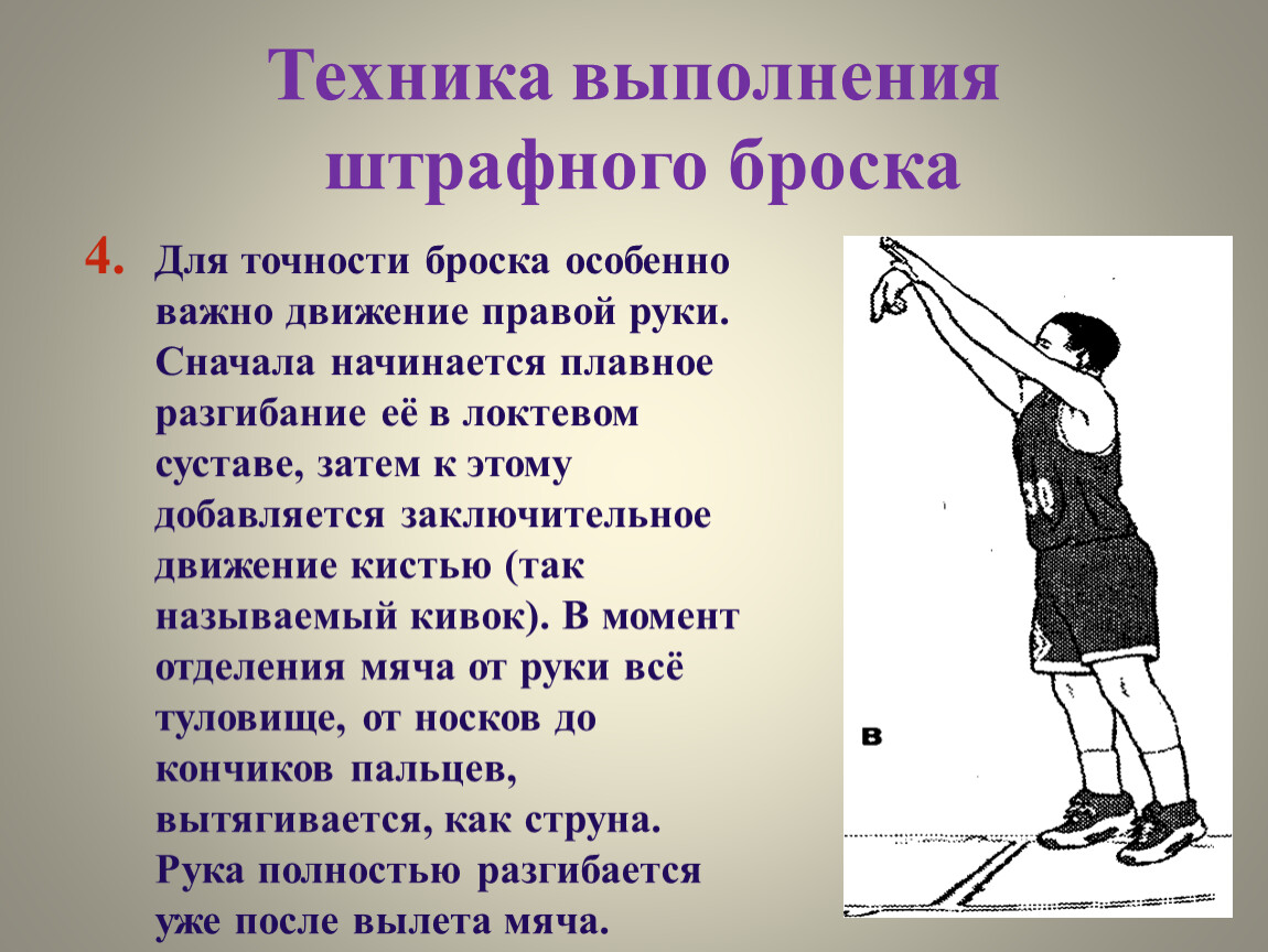 Для точности броска особенно важно движение правой руки. Сначала начинается плавное разгибание её в локтевом суставе, затем к этому добавляется заключительное движение кистью (так называемый кивок). В момент отделения мяча от руки всё туловище, от носков до кончиков пальцев, вытягивается, как струна. Рука полностью разгибается уже после вылета мяча.