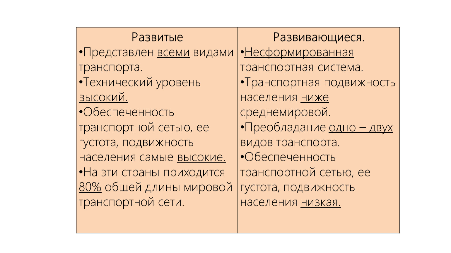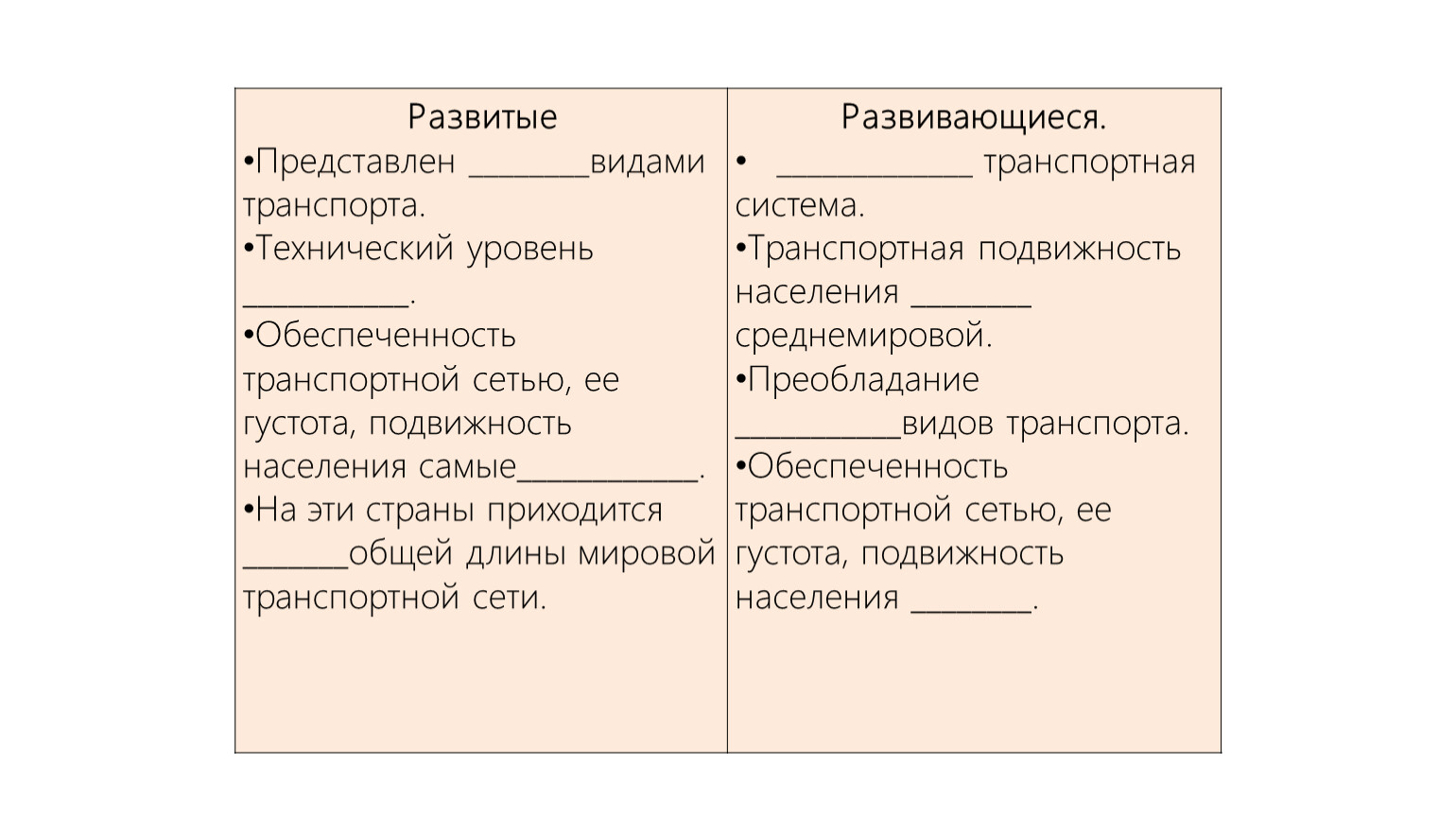 Развитые Технический уровень ___________. Обеспеченность транспортной сетью, ее густота, подвижность населения самые____________. На эти страны приходится _______общей длины мировой транспортной сети. | Развивающиеся. Транспортная подвижность населения ________ среднемировой. Преобладание ___________видов транспорта. Обеспеченность транспортной сетью, ее густота, подвижность населения ________. |