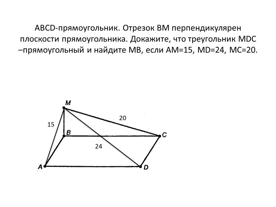 АВСD-прямоугольник. Отрезок ВМ перпендикулярен плоскости прямоугольника. Докажите, что треугольник МDС –прямоугольный и найдите МВ, если АМ=15, МD=24, МС=20.