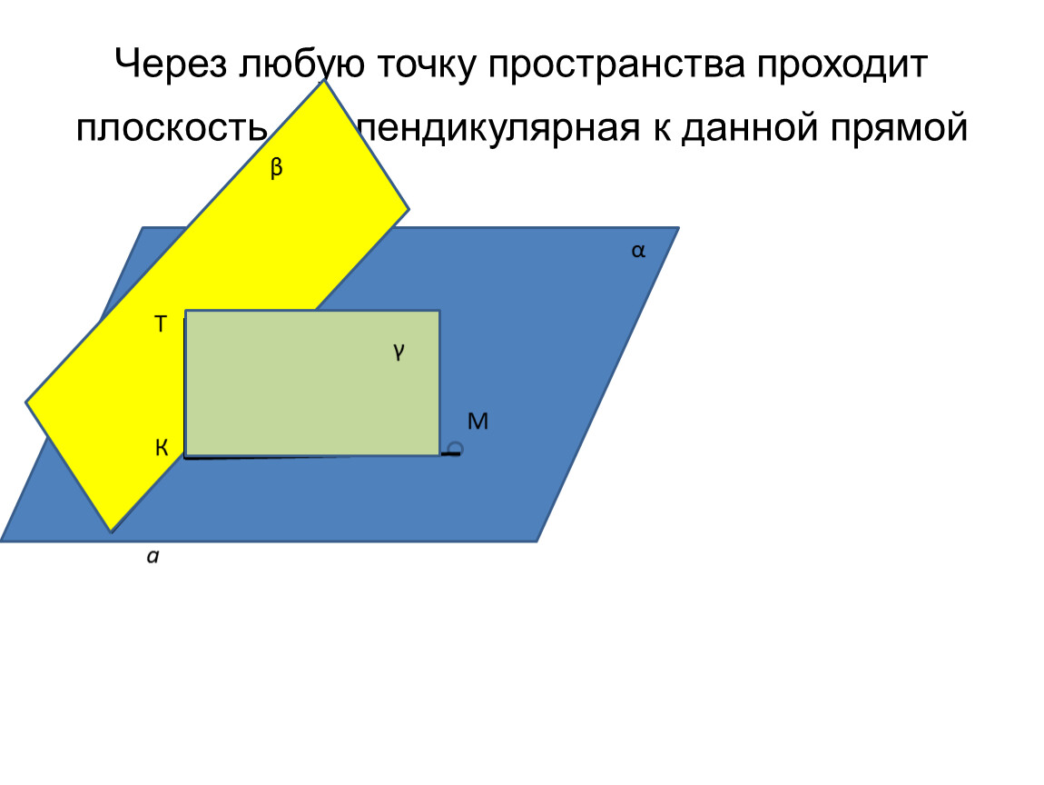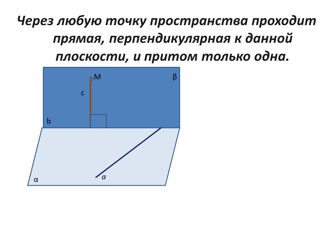 Через любую точку пространства проходит прямая, перпендикулярная к данной плоскости, и притом только одна.