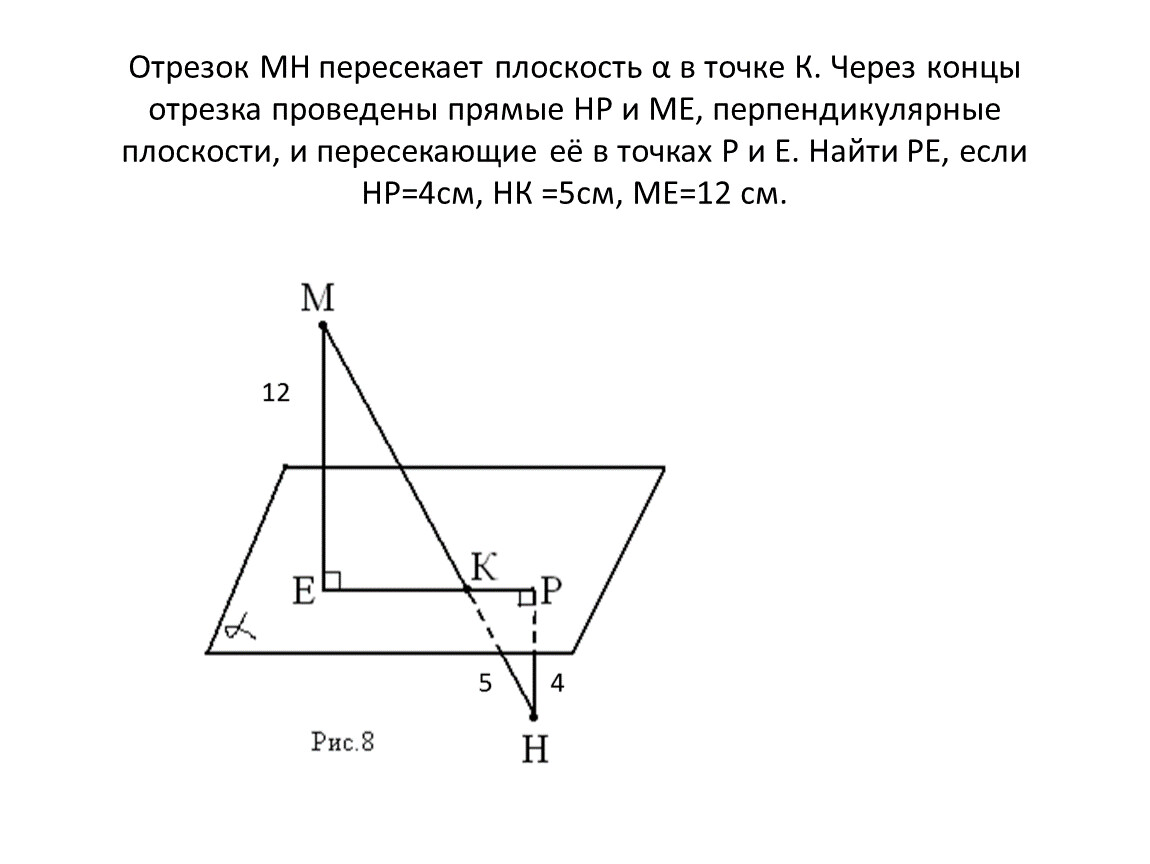 Отрезок МН пересекает плоскость α в точке К. Через концы отрезка проведены прямые НР и МЕ, перпендикулярные плоскости, и пересекающие её в точках Р и Е. Найти РЕ, если НР=4см, НК =5см, МЕ=12 см.