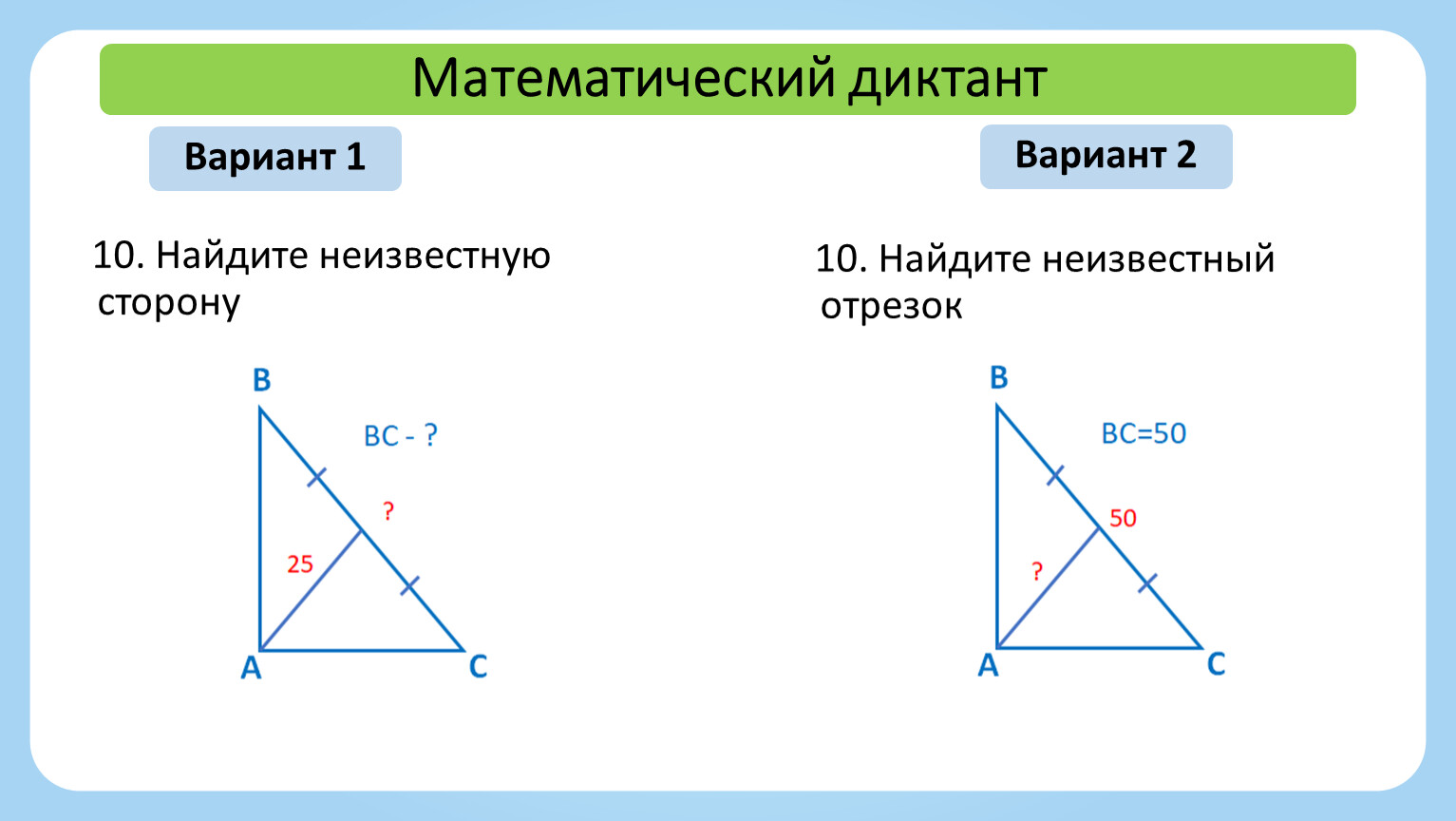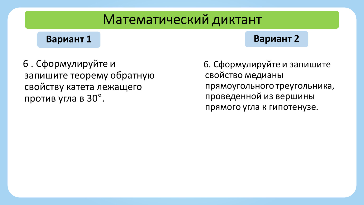6. Сформулируйте и запишите свойство медианы прямоугольного треугольника, проведенной из вершины прямого угла к гипотенузе.