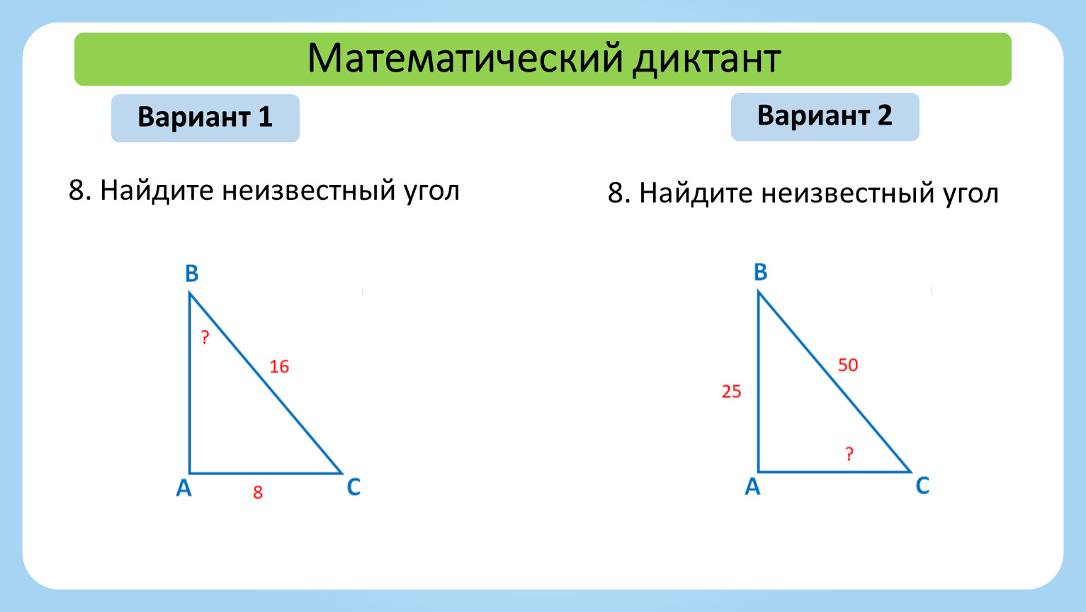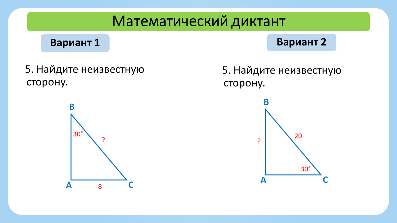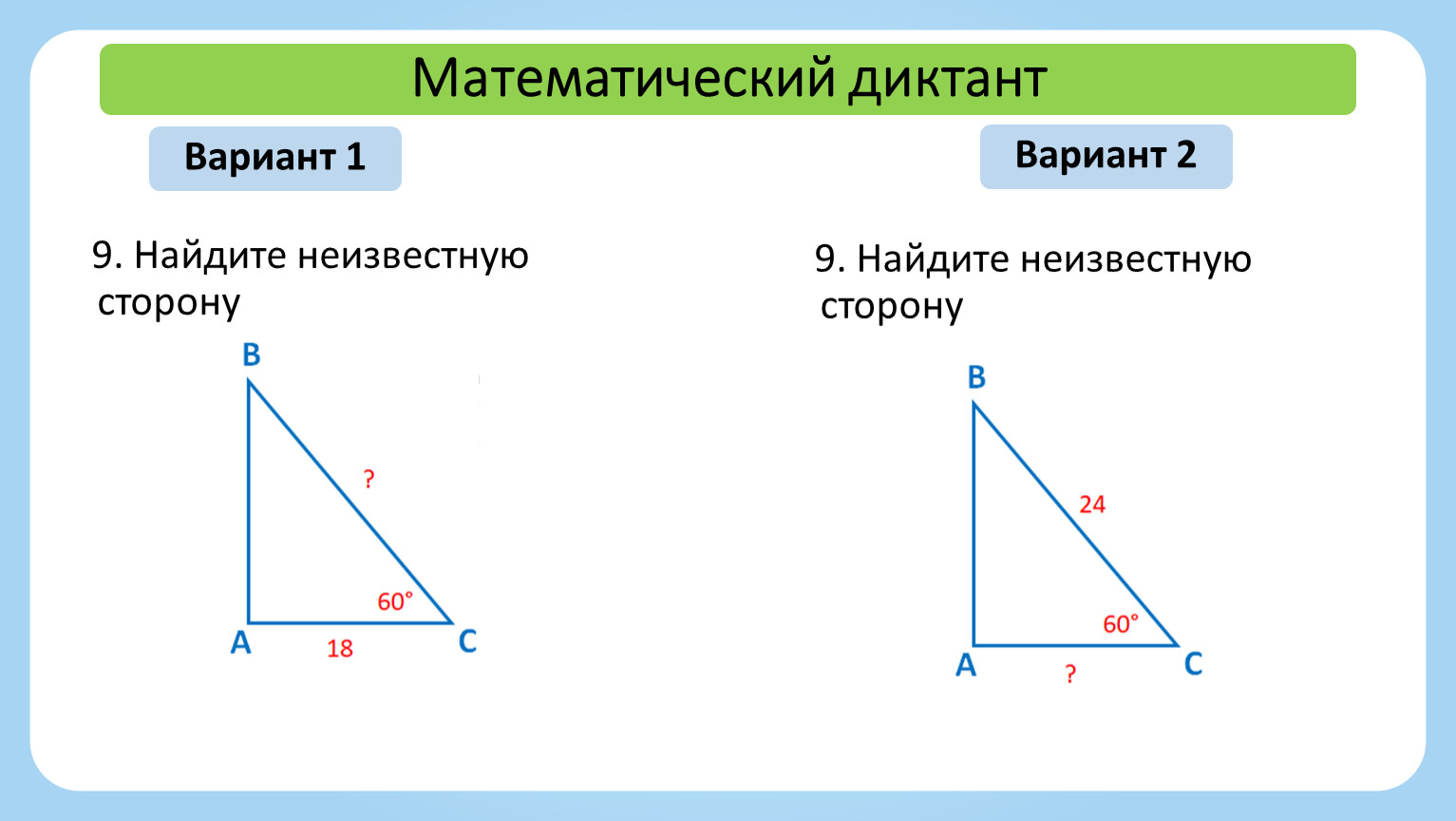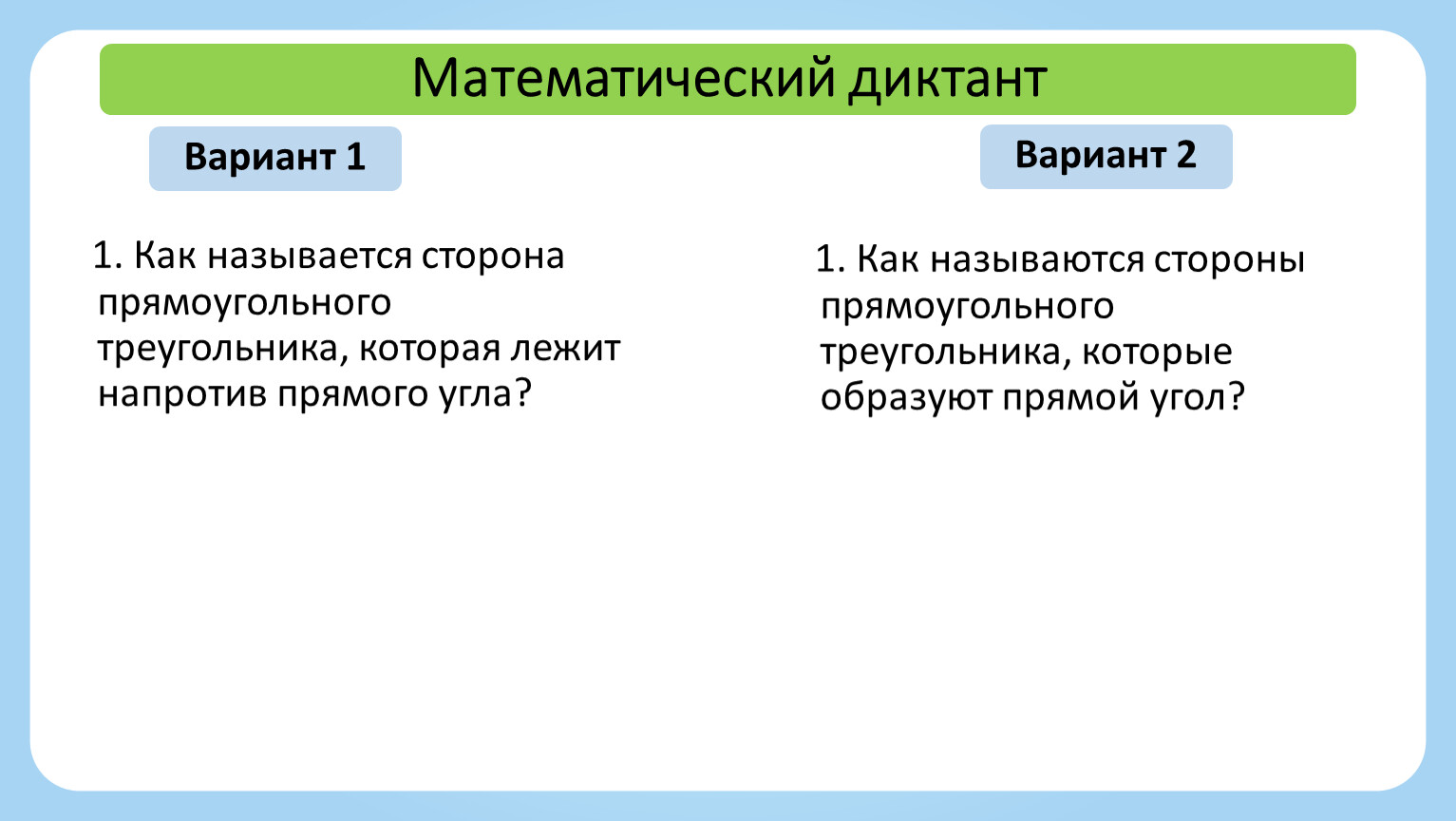 1. Как называется сторона прямоугольного треугольника, которая лежит напротив прямого угла?