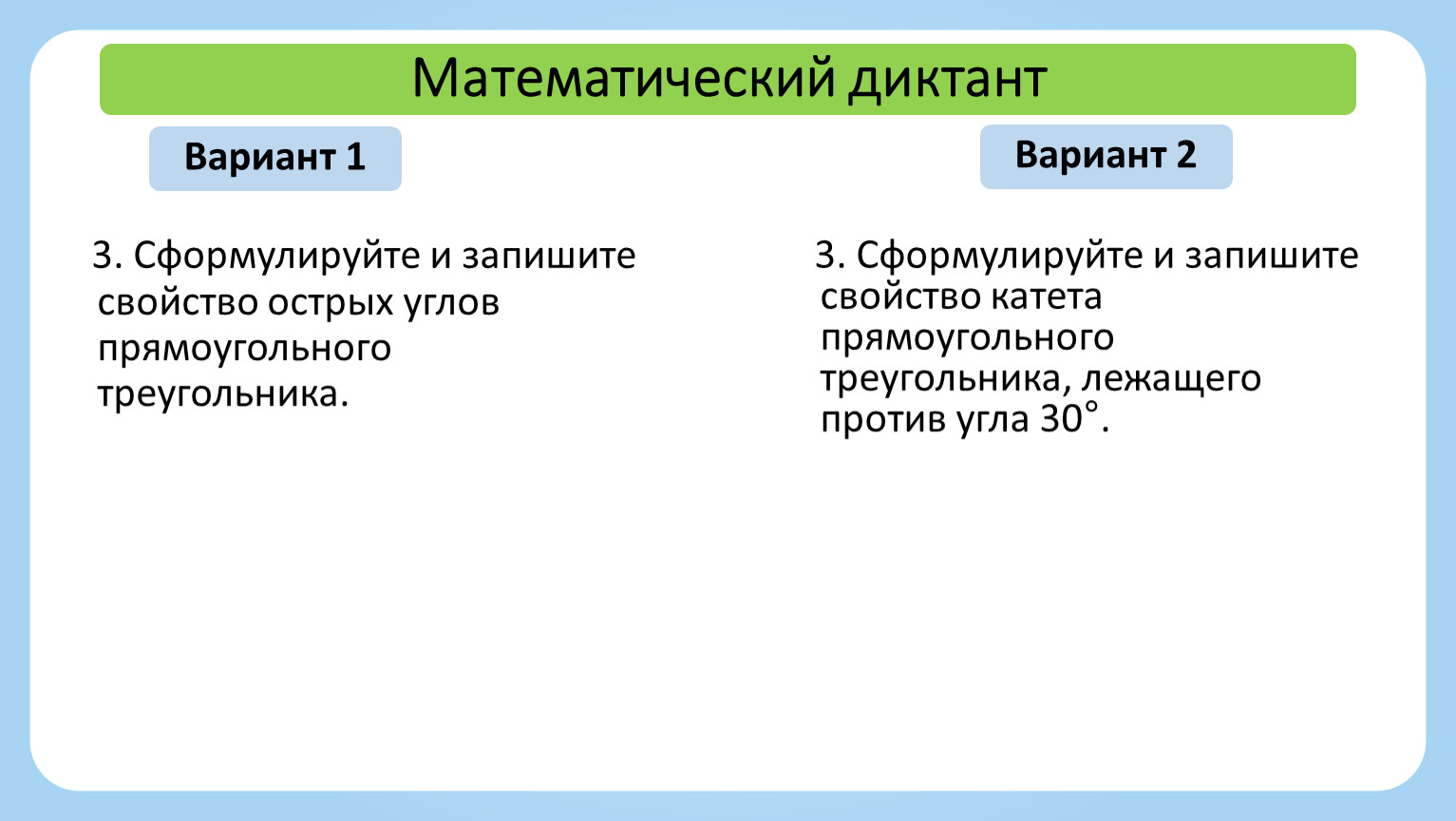 3. Сформулируйте и запишите свойство острых углов прямоугольного треугольника.