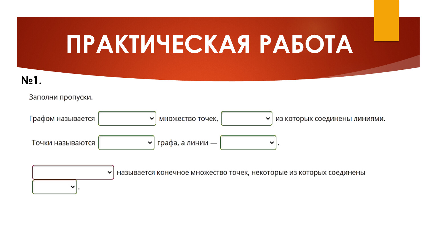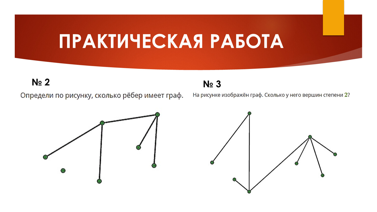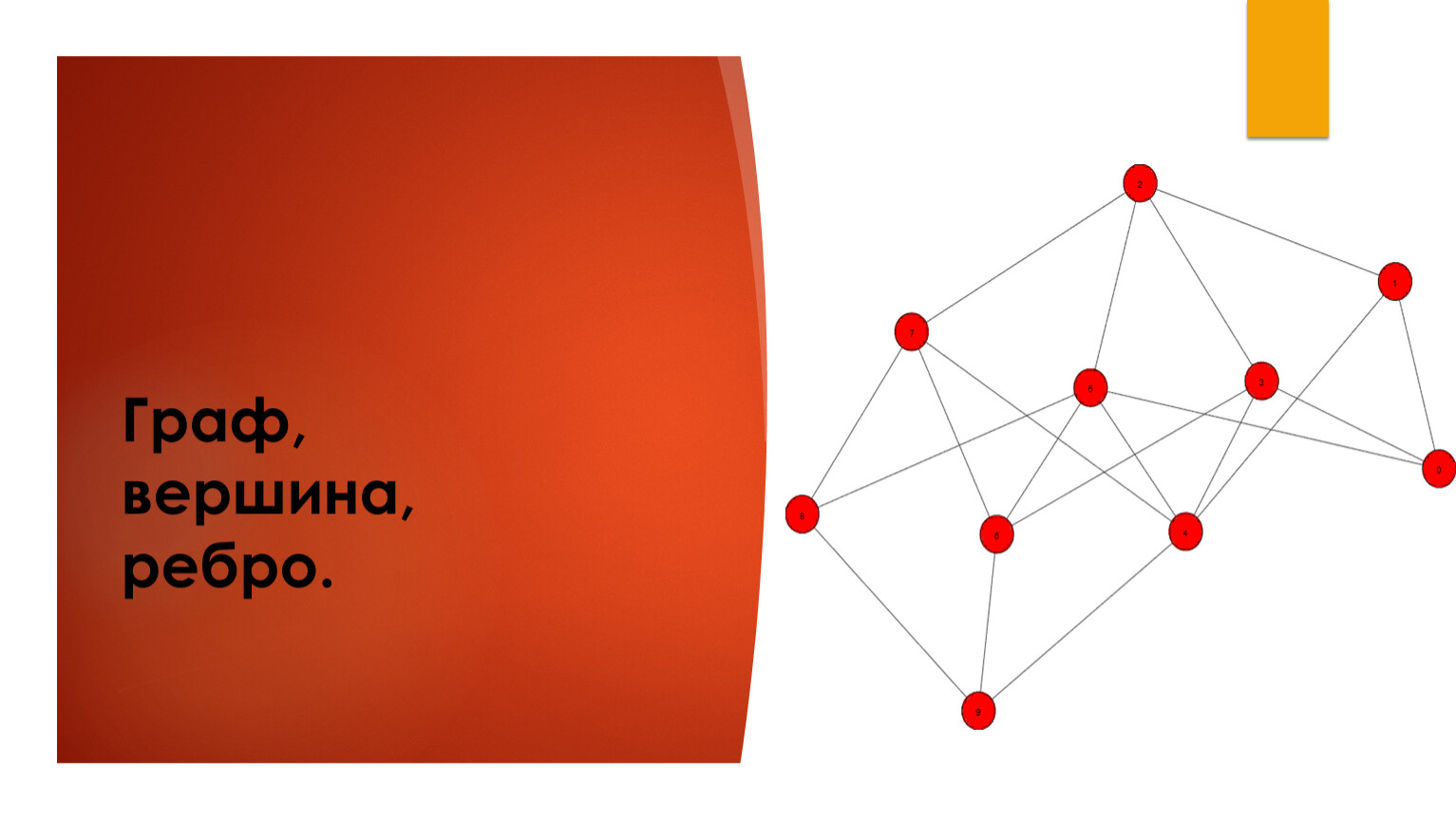 Графом называется конечное множество точек, некоторые из которых соединены линиями. При этом точки называются вершинами графа, а линии — рёбрами.