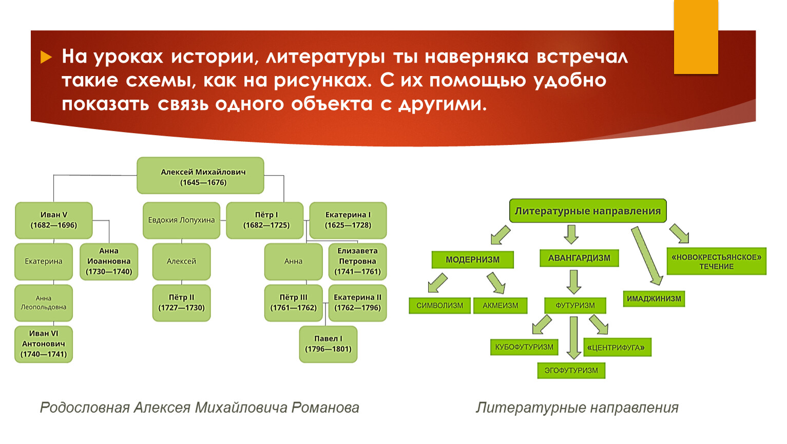 На уроках истории, литературы ты наверняка встречал такие схемы, как на рисунках. С их помощью удобно показать связь одного объекта с другими.