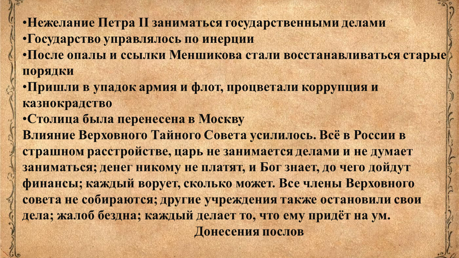 Влияние Верховного Тайного Совета усилилось. Всё в России в страшном расстройстве, царь не занимается делами и не думает заниматься; денег никому не платят, и Бог знает, до чего дойдут финансы; каждый ворует, сколько может. Все члены Верховного совета не собираются; другие учреждения также остановили свои дела; жалоб бездна; каждый делает то, что ему придёт на ум.