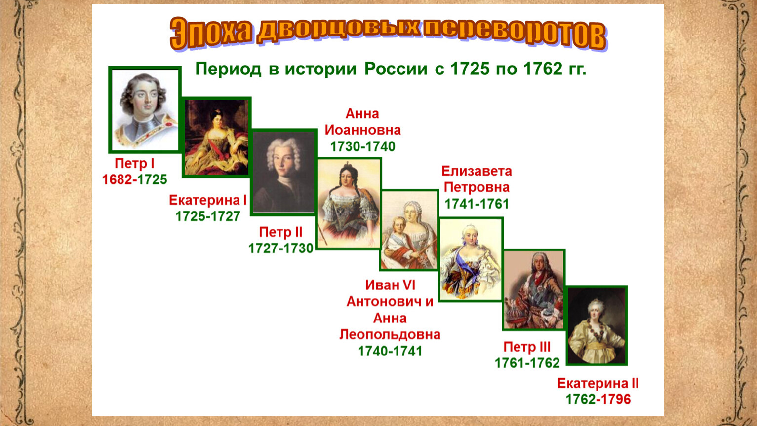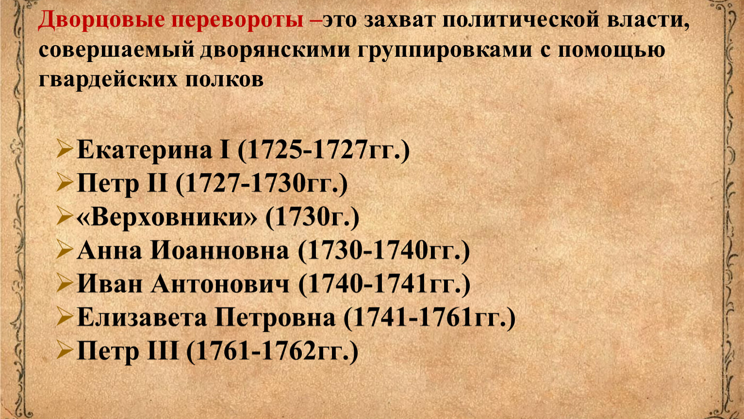 Дворцовые перевороты –это захват политической власти, совершаемый дворянскими группировками с помощью гвардейских полков