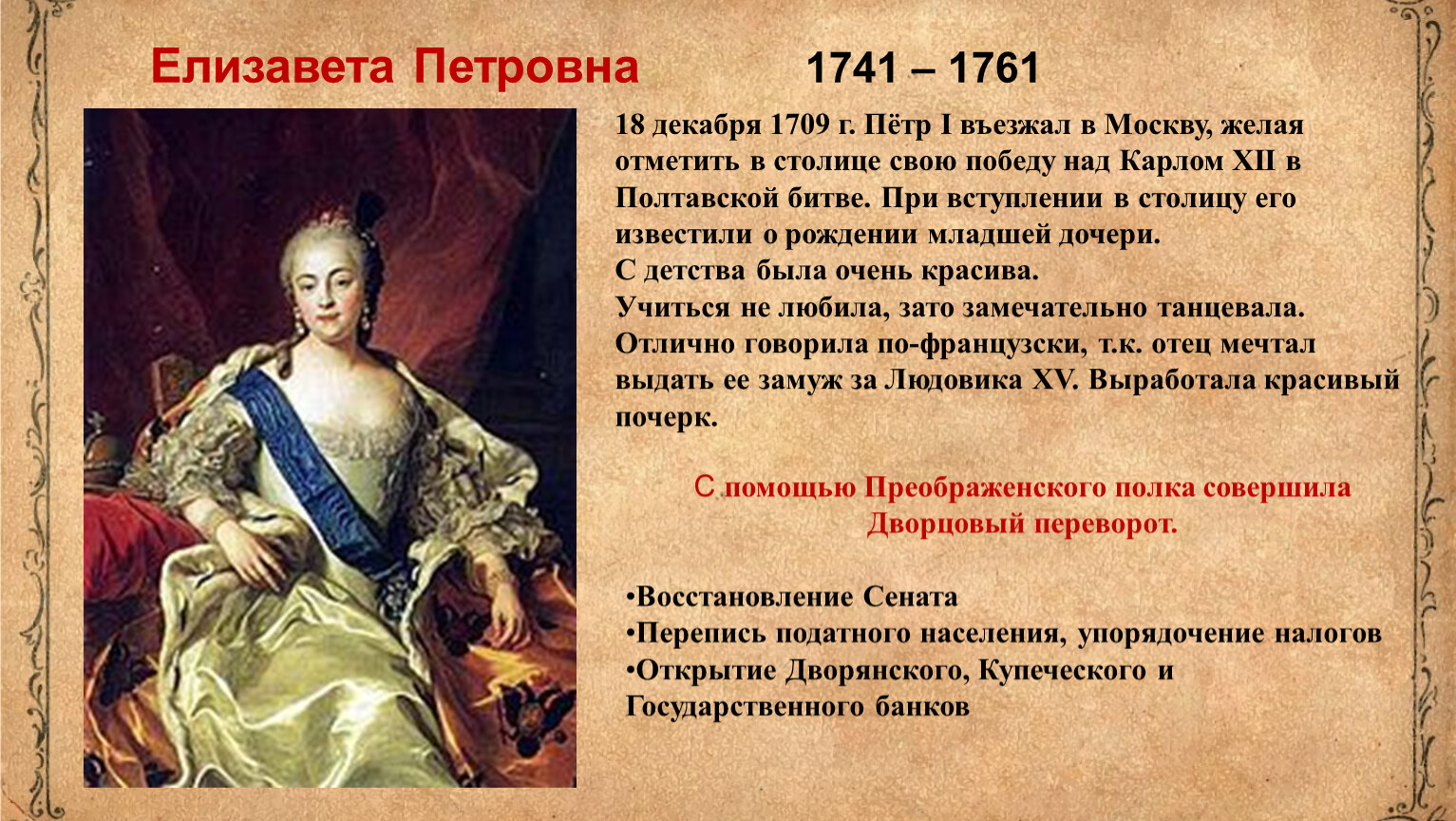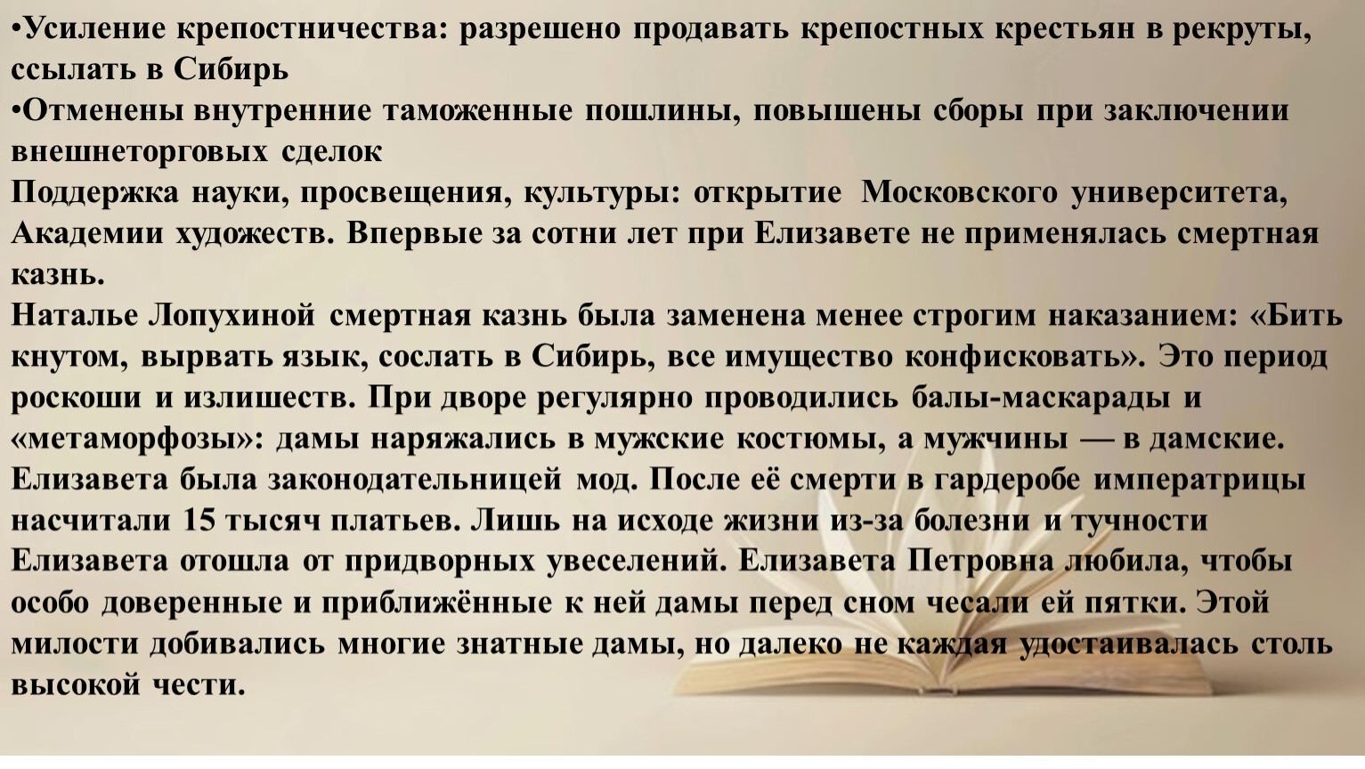 Поддержка науки, просвещения, культуры: открытие Московского университета, Академии художеств. Впервые за сотни лет при Елизавете не применялась смертная казнь.