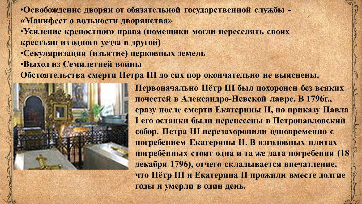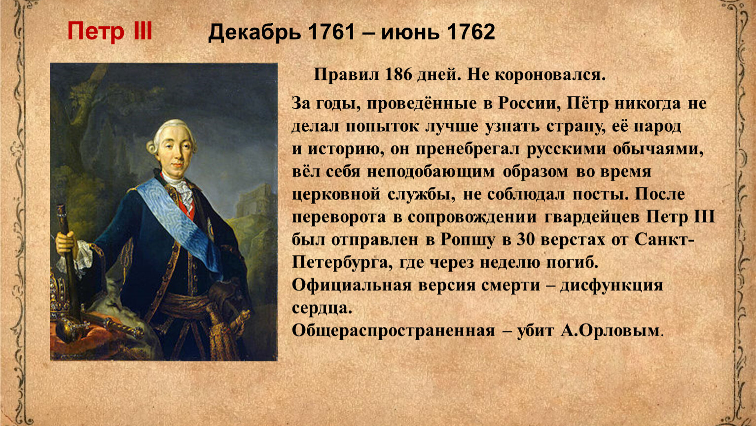 Обстоятельства смерти Петра III до сих пор окончательно не выяснены.