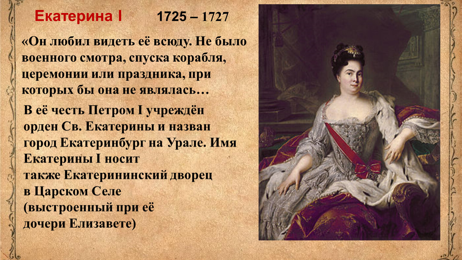 орден Св. Екатерины и назван город Екатеринбург на Урале. Имя Екатерины I носит также Екатерининский дворец в Царском Селе