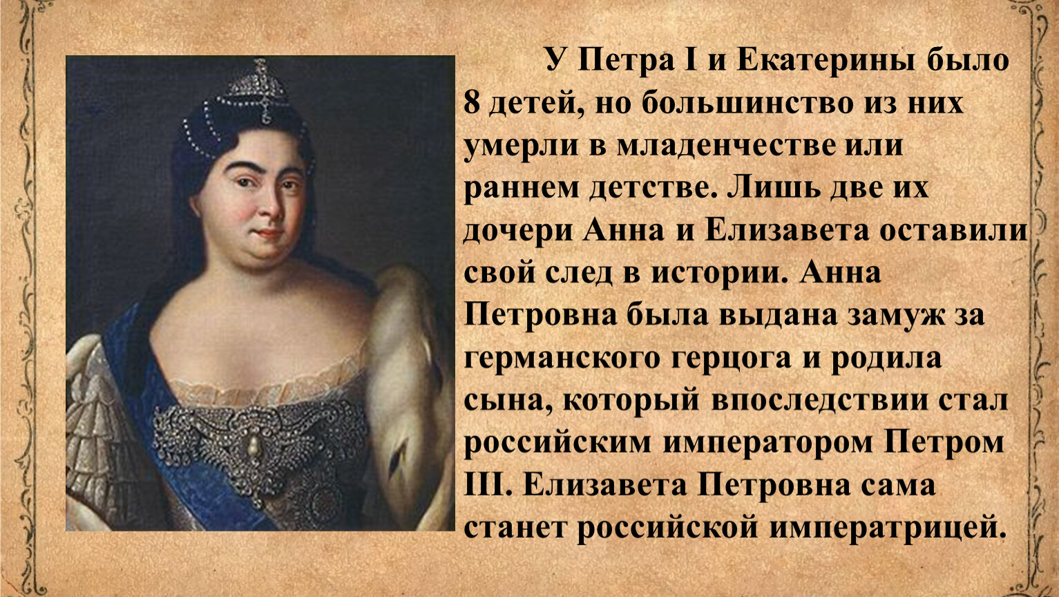 У Петра I и Екатерины было 8 детей, но большинство из них умерли в младенчестве или раннем детстве. Лишь две их дочери Анна и Елизавета оставили свой след в истории. Анна Петровна была выдана замуж за германского герцога и родила сына, который впоследствии стал российским императором Петром III. Елизавета Петровна сама станет российской императрицей.
