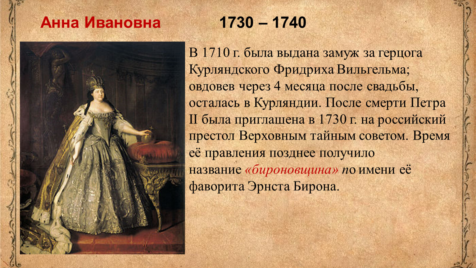 В 1710 г. была выдана замуж за герцога Курляндского Фридриха Вильгельма; овдовев через 4 месяца после свадьбы, осталась в Курляндии. После смерти Петра II была приглашена в 1730 г. на российский престол Верховным тайным советом. Время её правления позднее получило название «бироновщина» по имени её фаворита Эрнста Бирона.