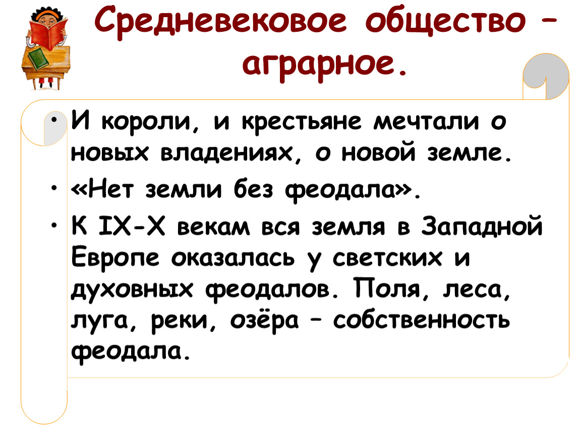 К IX-X векам вся земля в Западной Европе оказалась у светских и духовных феодалов. Поля, леса, луга, реки, озёра – собственность феодала.