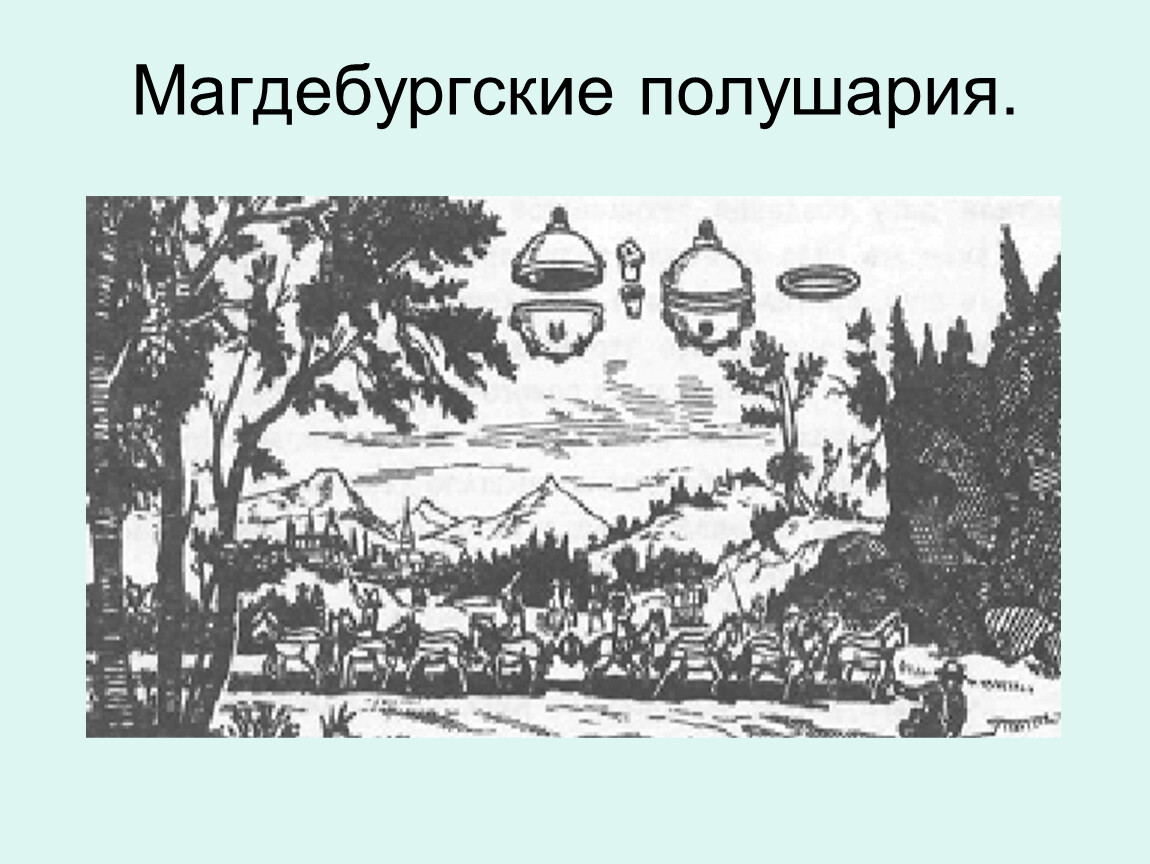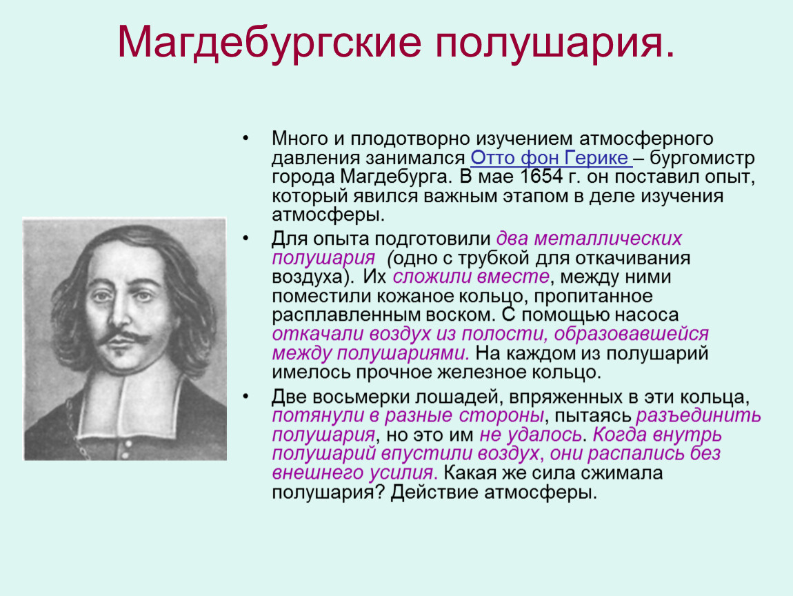 Много и плодотворно изучением атмосферного давления занимался Отто фон Герике – бургомистр города Магдебурга. В мае 1654 г. он поставил опыт, который явился важным этапом в деле изучения атмосферы.