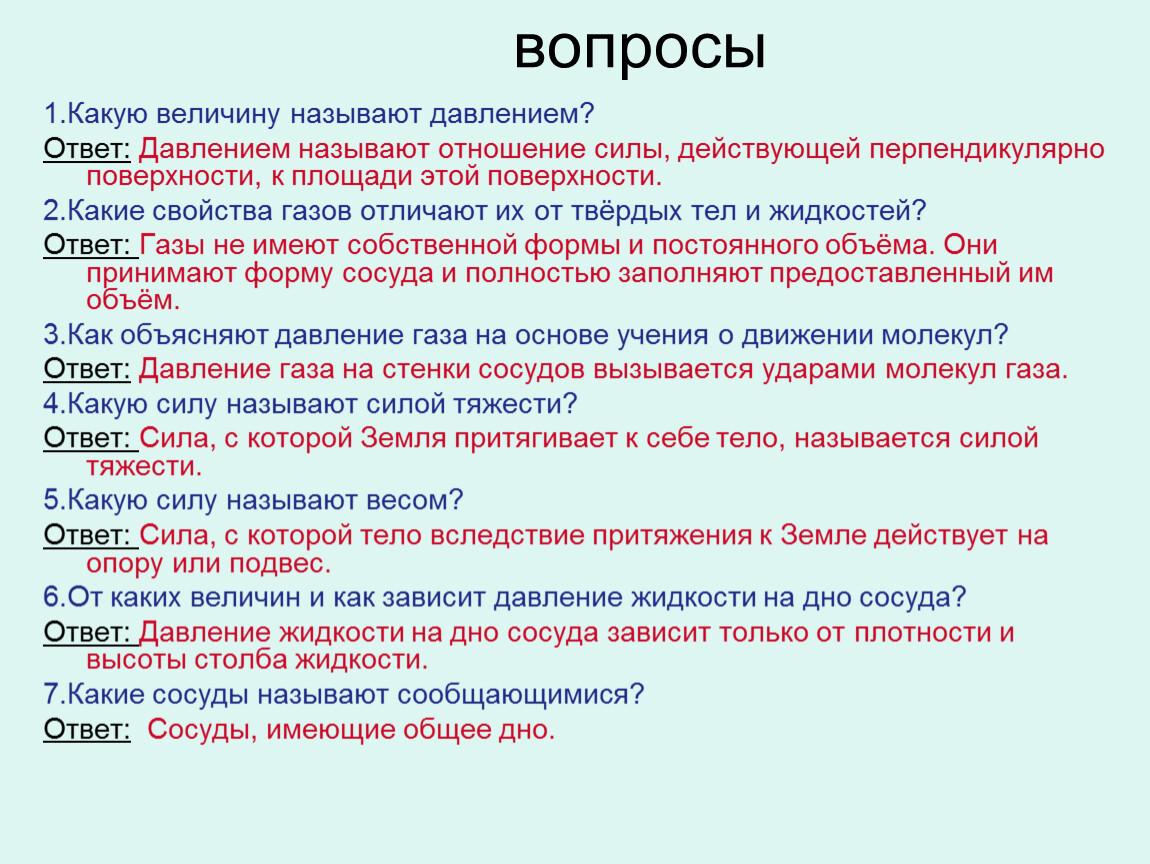 Ответ: Давлением называют отношение силы, действующей перпендикулярно поверхности, к площади этой поверхности.