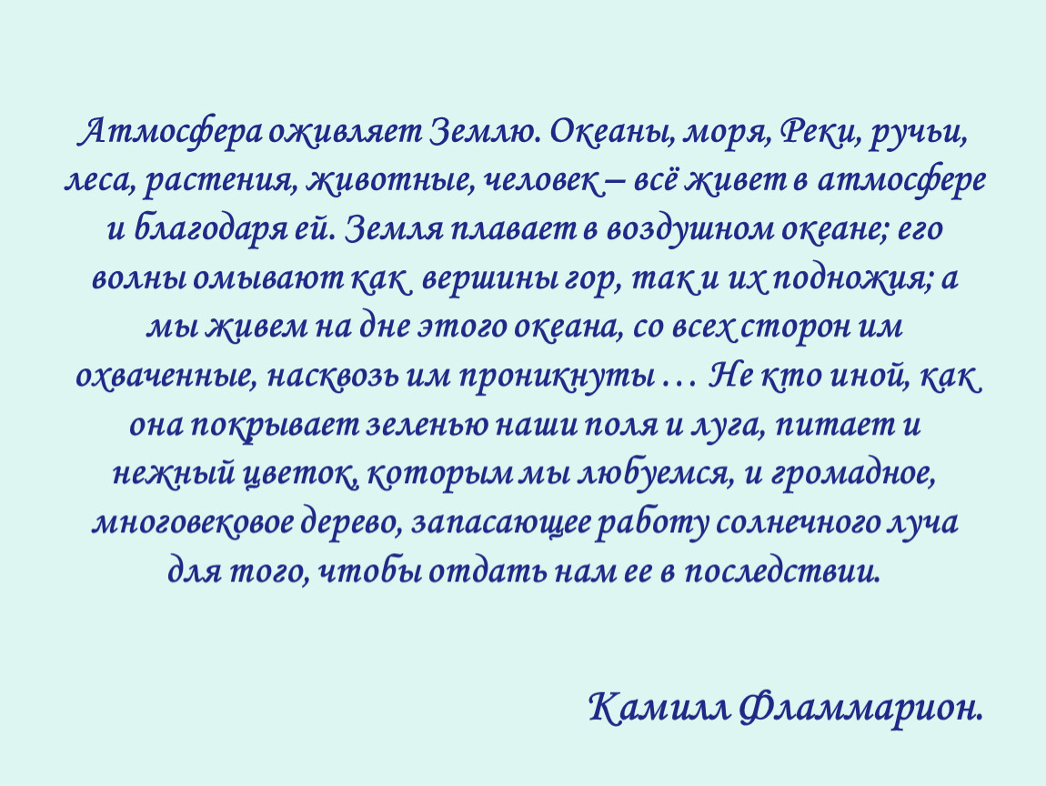 Атмосфера оживляет Землю. Океаны, моря, Реки, ручьи, леса, растения, животные, человек – всё живет в атмосфере и благодаря ей. Земля плавает в воздушном океане; его волны омывают как вершины гор, так и их подножия; а мы живем на дне этого океана, со всех сторон им охваченные, насквозь им проникнуты … Не кто иной, как она покрывает зеленью наши поля и луга, питает и нежный цветок, которым мы любуемся, и громадное, многовековое дерево, запасающее работу солнечного луча для того, чтобы отдать нам ее в последствии.