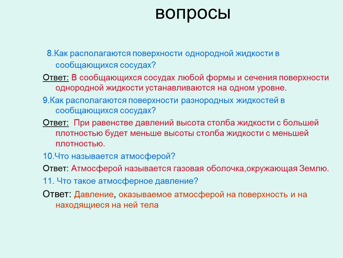 9.Как располагаются поверхности разнородных жидкостей в сообщающихся сосудах?