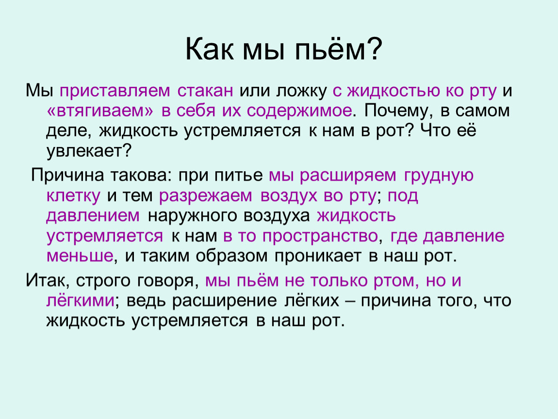 Причина такова: при питье мы расширяем грудную клетку и тем разрежаем воздух во рту; под давлением наружного воздуха жидкость устремляется к нам в то пространство, где давление меньше, и таким образом проникает в наш рот.