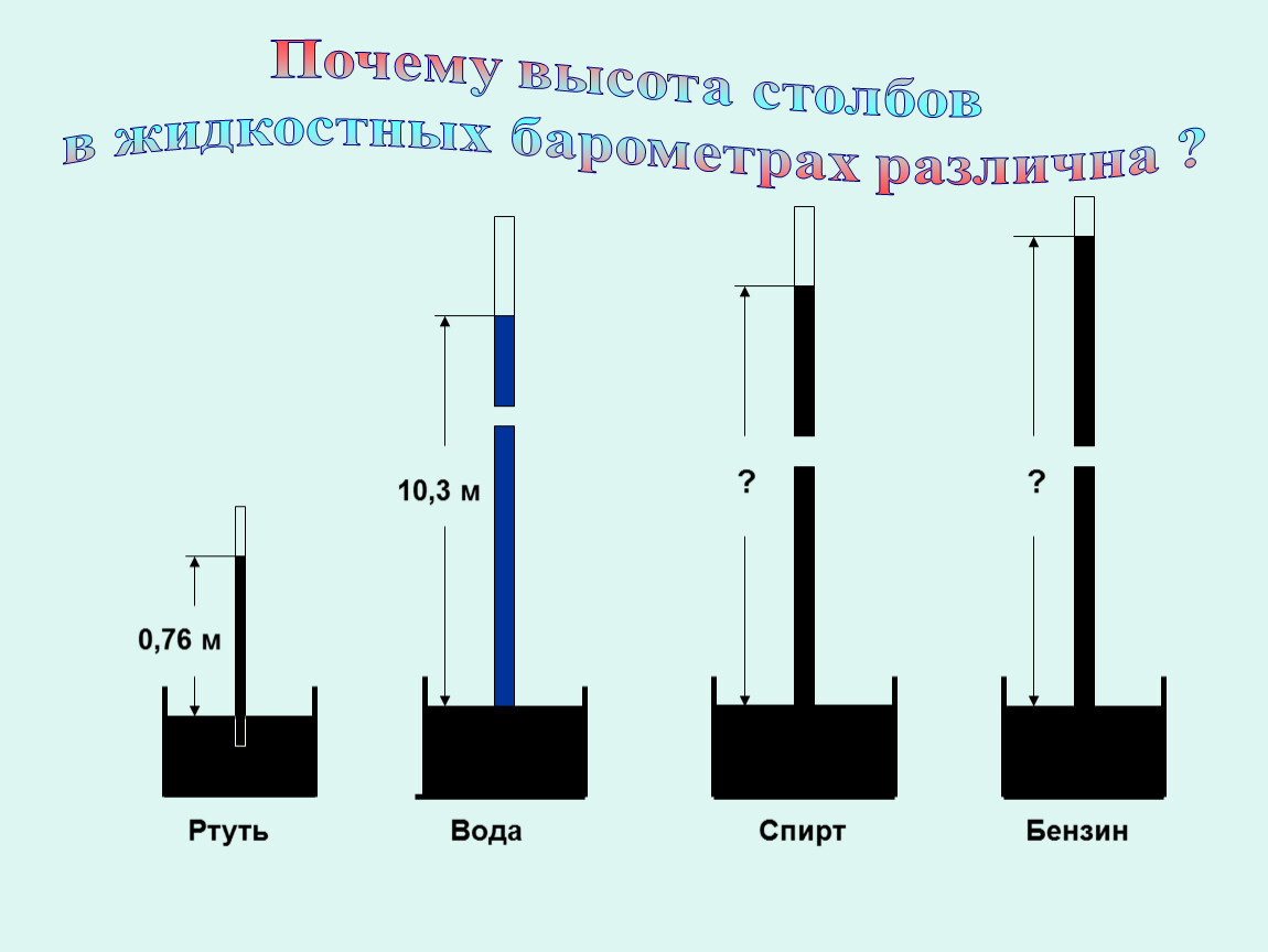 Ответ: При равенстве давлений высота столба жидкости с большей плотностью будет меньше высоты столба жидкости с меньшей плотностью.