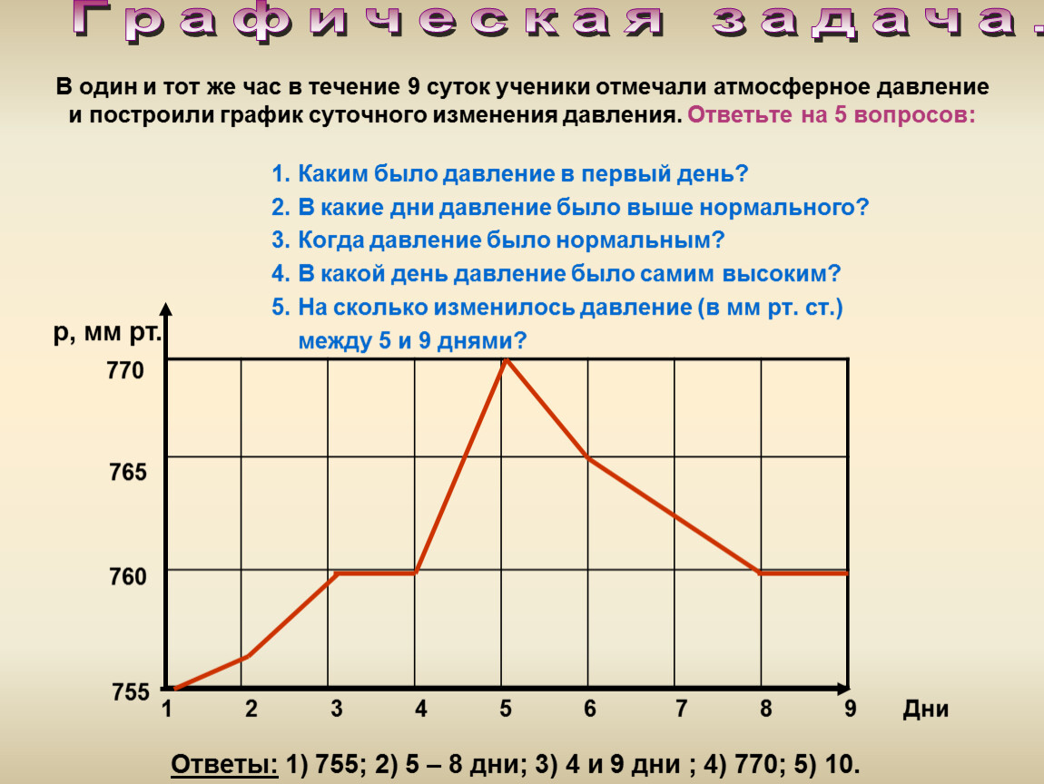 В один и тот же час в течение 9 суток ученики отмечали атмосферное давление и построили график суточного изменения давления. Ответьте на 5 вопросов: