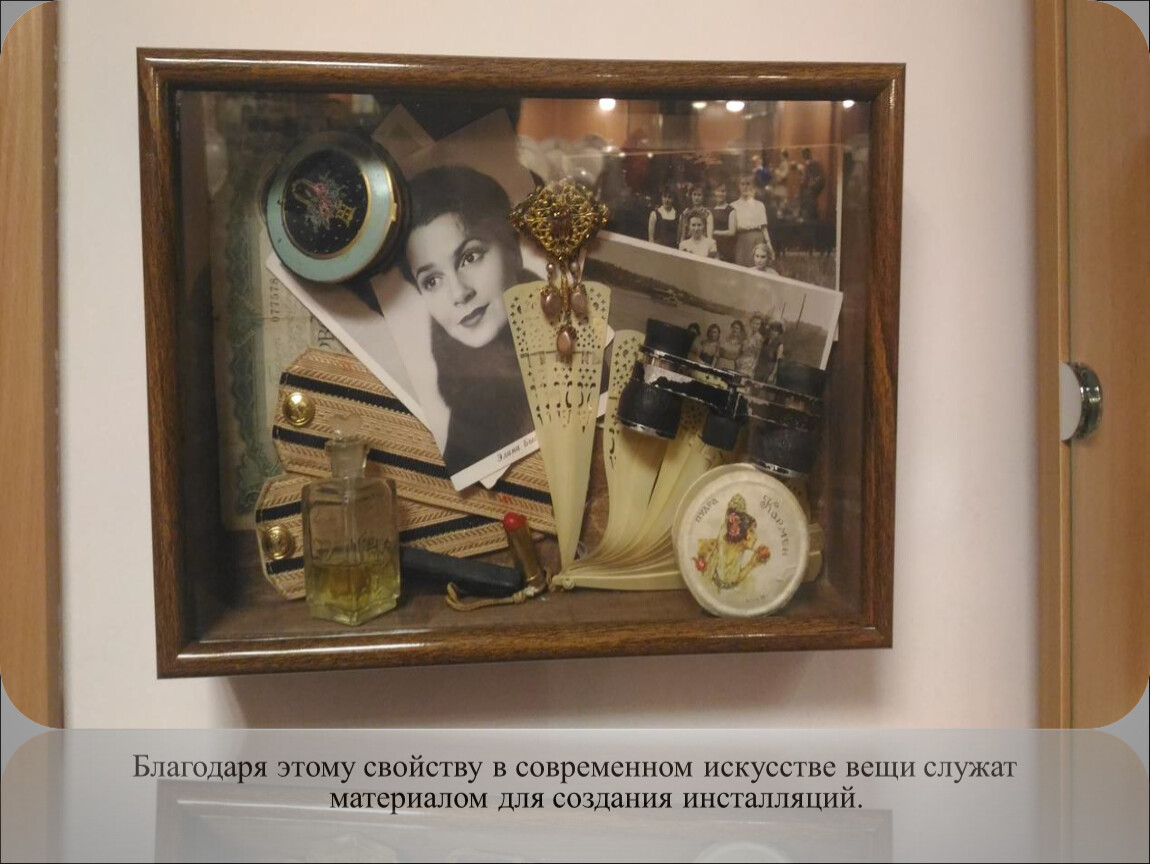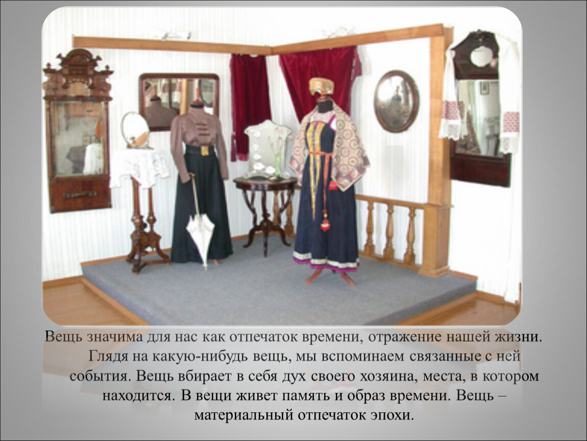 Вещь значима для нас как отпечаток времени, отражение нашей жизни. Глядя на какую-нибудь вещь, мы вспоминаем связанные с ней события. Вещь вбирает в себя дух своего хозяина, места, в котором находится. В вещи живет память и образ времени. Вещь – материальный отпечаток эпохи.