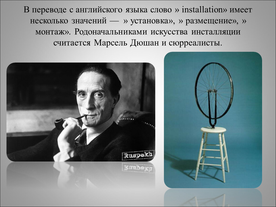 В переводе с английского языка слово » installation» имеет несколько значений — » установка», » размещение», » монтаж». Родоначальниками искусства инсталляции считается Марсель Дюшан и сюрреалисты.
