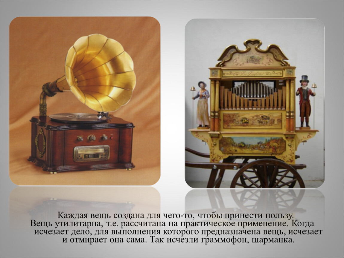 Вещь утилитарна, т.е. рассчитана на практическое применение. Когда исчезает дело, для выполнения которого предназначена вещь, исчезает и отмирает она сама. Так исчезли граммофон, шарманка.