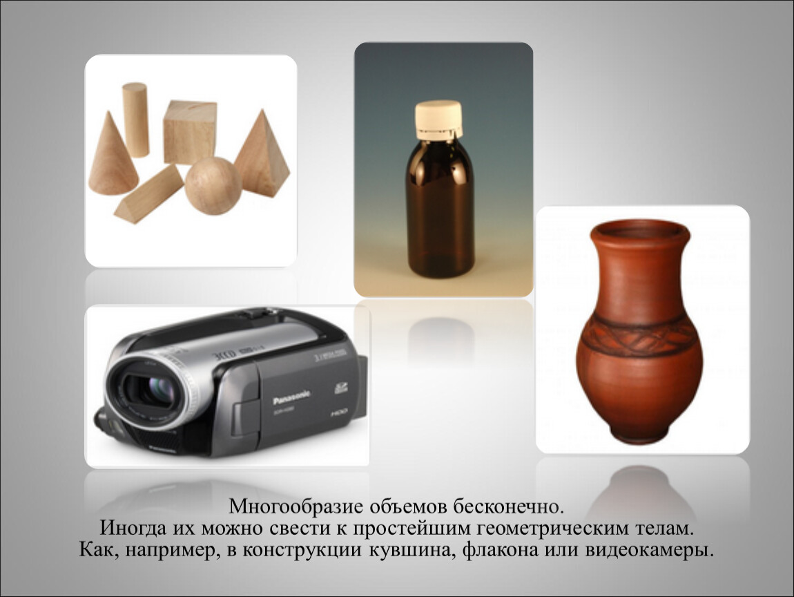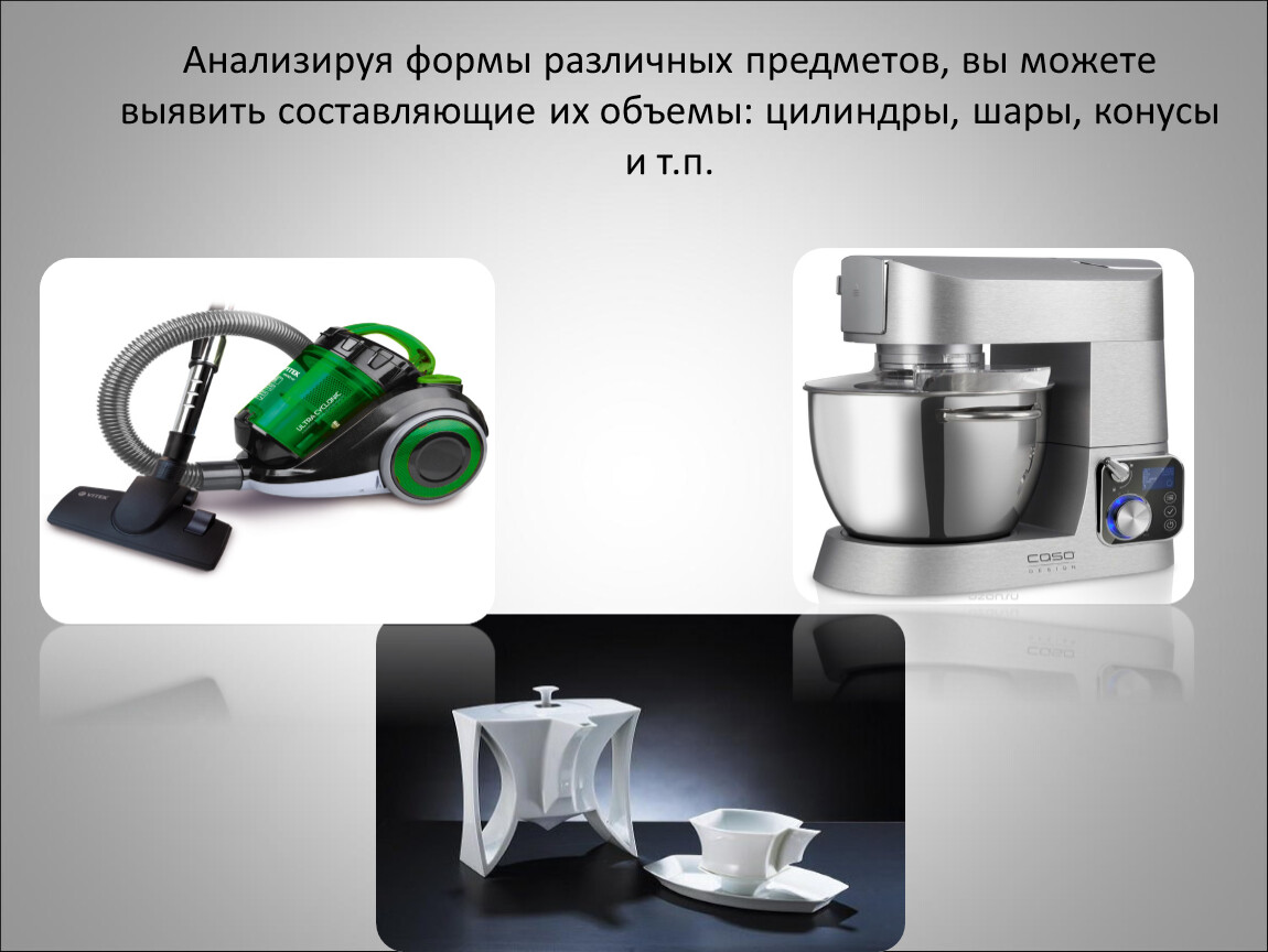 Анализируя формы различных предметов, вы можете выявить составляющие их объемы: цилиндры, шары, конусы и т.п.