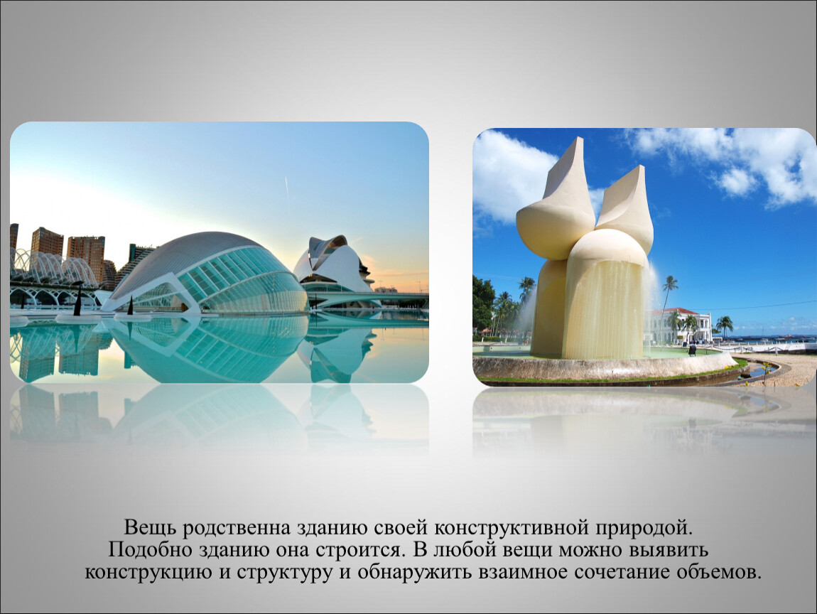 Подобно зданию она строится. В любой вещи можно выявить конструкцию и структуру и обнаружить взаимное сочетание объемов.
