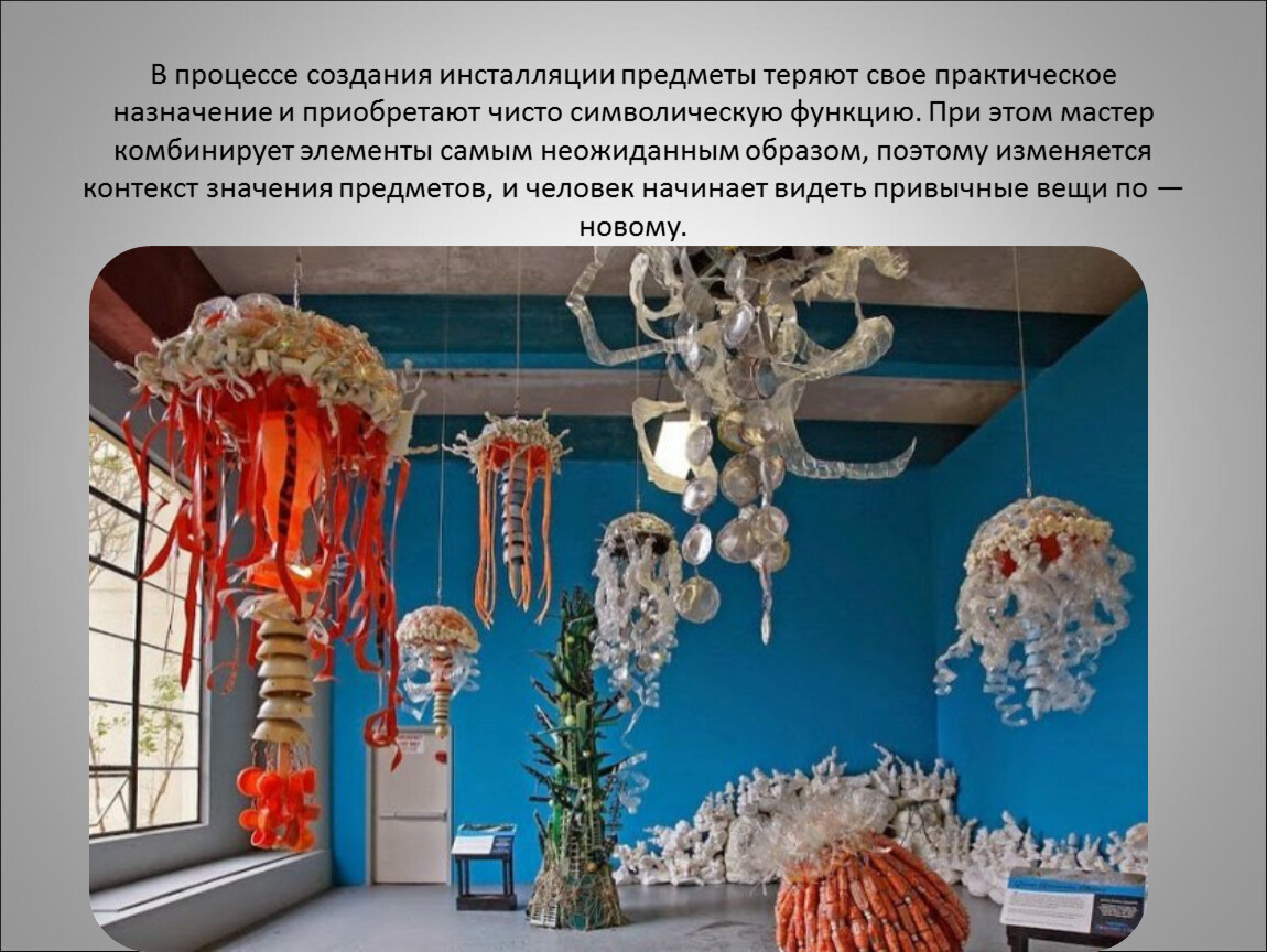 В процессе создания инсталляции предметы теряют свое практическое назначение и приобретают чисто символическую функцию. При этом мастер комбинирует элементы самым неожиданным образом, поэтому изменяется контекст значения предметов, и человек начинает видеть привычные вещи по —новому.