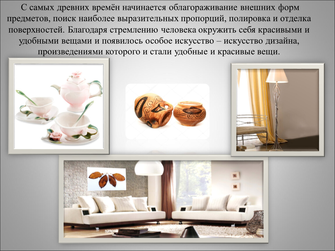 С самых древних времён начинается облагораживание внешних форм предметов, поиск наиболее выразительных пропорций, полировка и отделка поверхностей. Благодаря стремлению человека окружить себя красивыми и удобными вещами и появилось особое искусство – искусство дизайна, произведениями которого и стали удобные и красивые вещи.