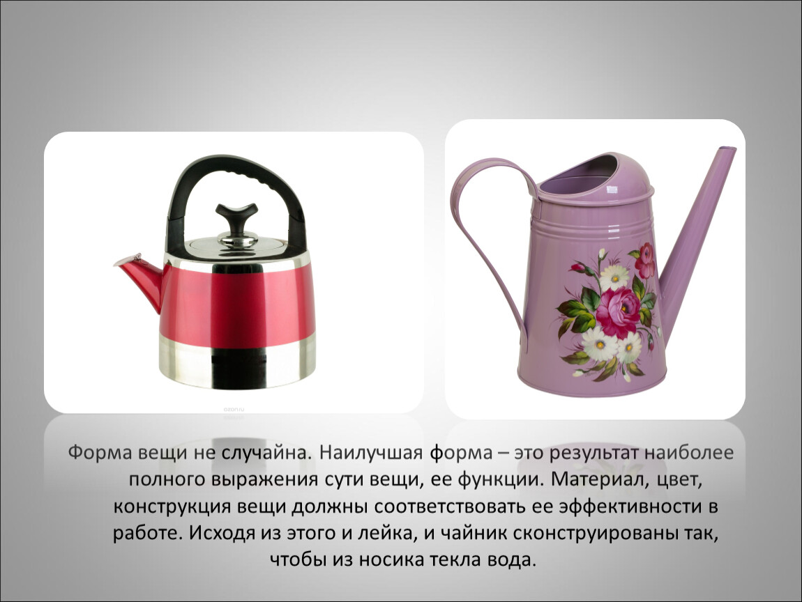 Форма вещи не случайна. Наилучшая форма – это результат наиболее полного выражения сути вещи, ее функции. Материал, цвет, конструкция вещи должны соответствовать ее эффективности в работе. Исходя из этого и лейка, и чайник сконструированы так,