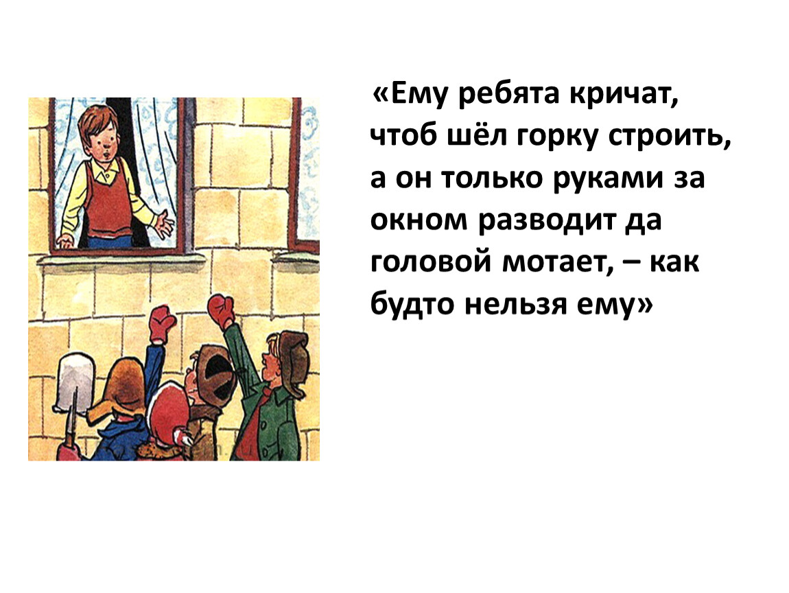 3. «Ему ребята кричат, чтоб шёл горку строить, а он только руками за окном разводит да головой мотает, – как будто нельзя ему»