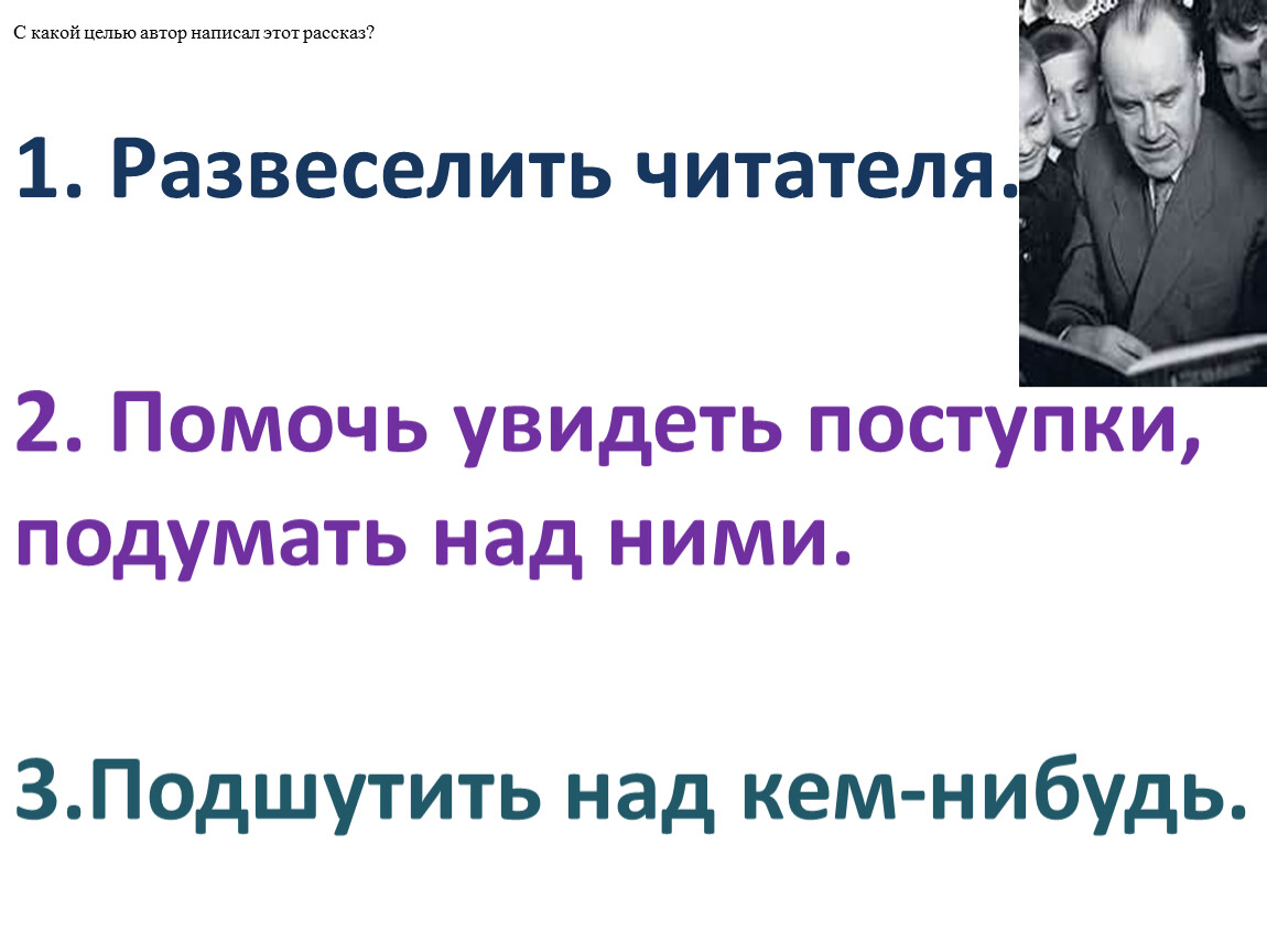 1. Развеселить читателя.2. Помочь увидеть поступки, подумать над ними.3.Подшутить над кем-нибудь.