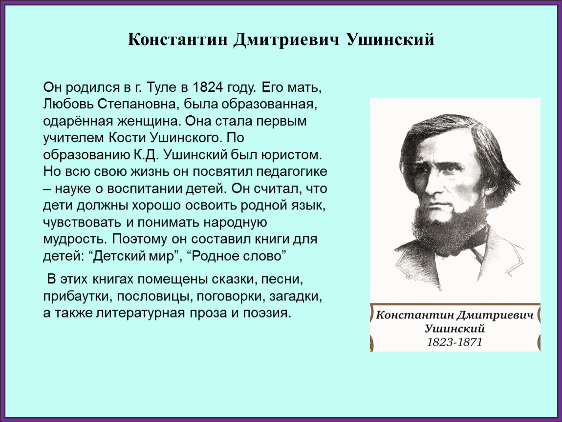 Он родился в г. Туле в 1824 году. Его мать, Любовь Степановна, была образованная, одарённая женщина. Она стала первым учителем Кости Ушинского. По образованию К.Д. Ушинский был юристом. Но всю свою жизнь он посвятил педагогике – науке о воспитании детей. Он считал, что дети должны хорошо освоить родной язык, чувствовать и понимать народную мудрость. Поэтому он составил книги для детей: “Детский мир”, “Родное слово”