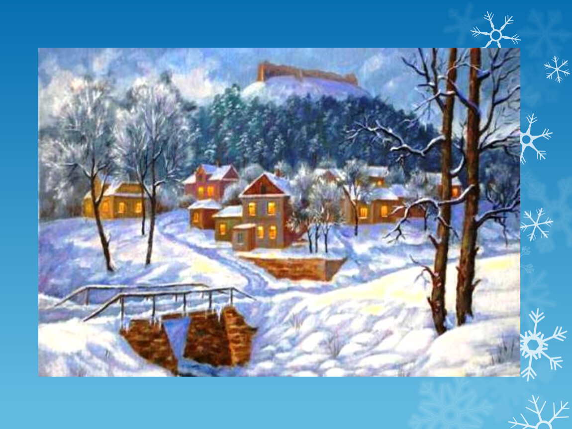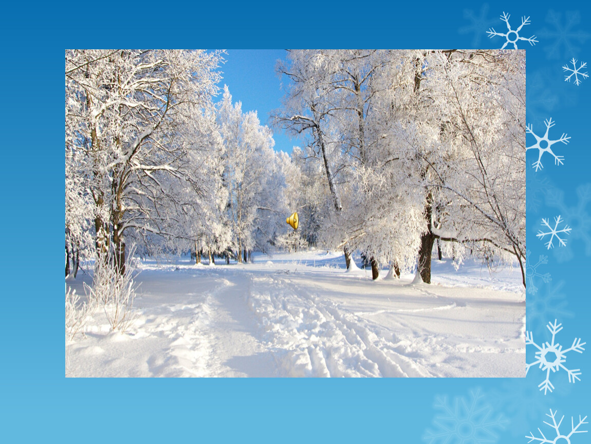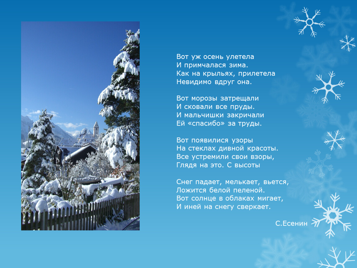 Вот уж осень улетелаИ примчалася зима.Как на крыльях, прилетелаНевидимо вдруг она.Вот морозы затрещалиИ сковали все пруды.И мальчишки закричалиЕй «спасибо» за труды.Вот появилися узорыНа стеклах дивной красоты.Все устремили свои взоры,Глядя на это. С высотыСнег падает, мелькает, вьется,Ложится белой пеленой.Вот солнце в облаках мигает,И иней на снегу сверкает. С.Есенин