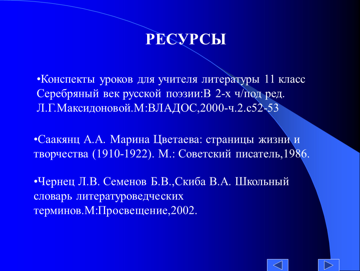 Конспекты уроков для учителя литературы 11 класс Серебряный век русской поэзии:В 2-х ч/под ред. Л.Г.Максидоновой.М:ВЛАДОС,2000-ч.2.с52-53
