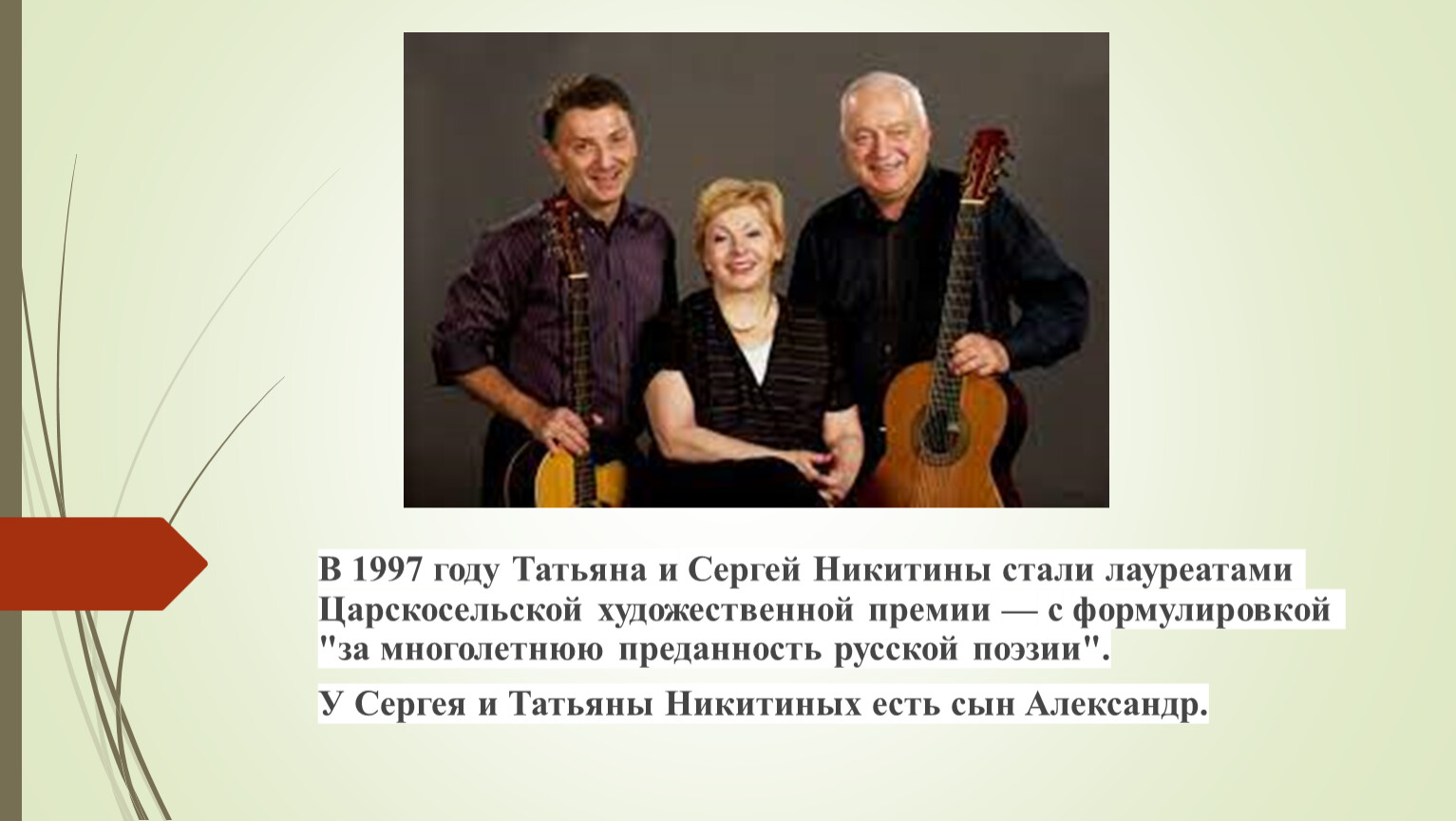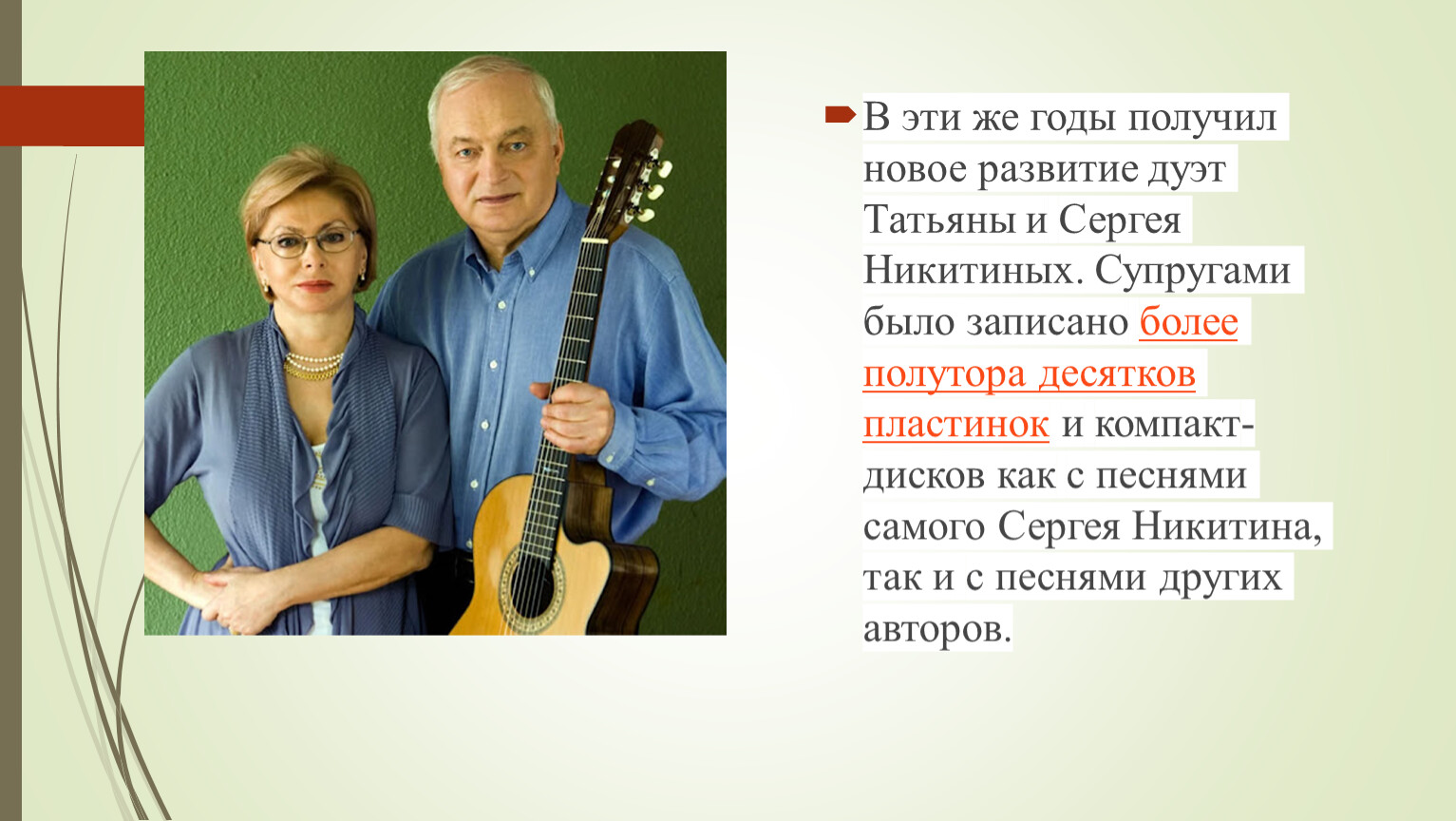 В эти же годы получил новое развитие дуэт Татьяны и Сергея Никитиных. Супругами было записано более полутора десятков пластинок и компакт-дисков как с песнями самого Сергея Никитина, так и с песнями других авторов.