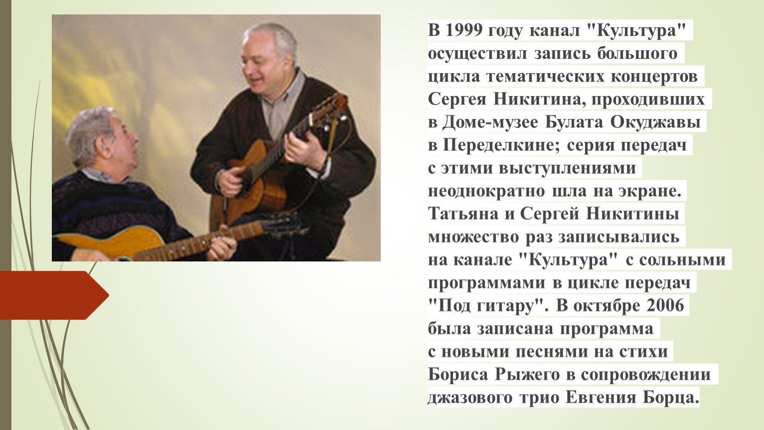 В 1999 году канал "Культура" осуществил запись большого цикла тематических концертов Сергея Никитина, проходивших в Доме-музее Булата Окуджавы в Переделкине; серия передач с этими выступлениями неоднократно шла на экране. Татьяна и Сергей Никитины множество раз записывались на канале "Культура" с сольными программами в цикле передач "Под гитару". В октябре 2006 была записана программа с новыми песнями на стихи Бориса Рыжего в сопровождении джазового трио Евгения Борца.