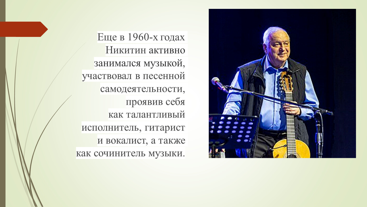 Еще в 1960-х годах Никитин активно занимался музыкой, участвовал в песенной самодеятельности, проявив себя как талантливый исполнитель, гитарист и вокалист, а также как сочинитель музыки.