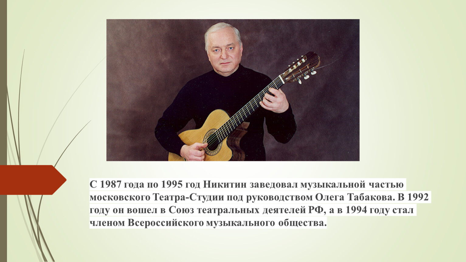 С 1987 года по 1995 год Никитин заведовал музыкальной частью московского Театра-Студии под руководством Олега Табакова. В 1992 году он вошел в Союз театральных деятелей РФ, а в 1994 году стал членом Всероссийского музыкального общества.