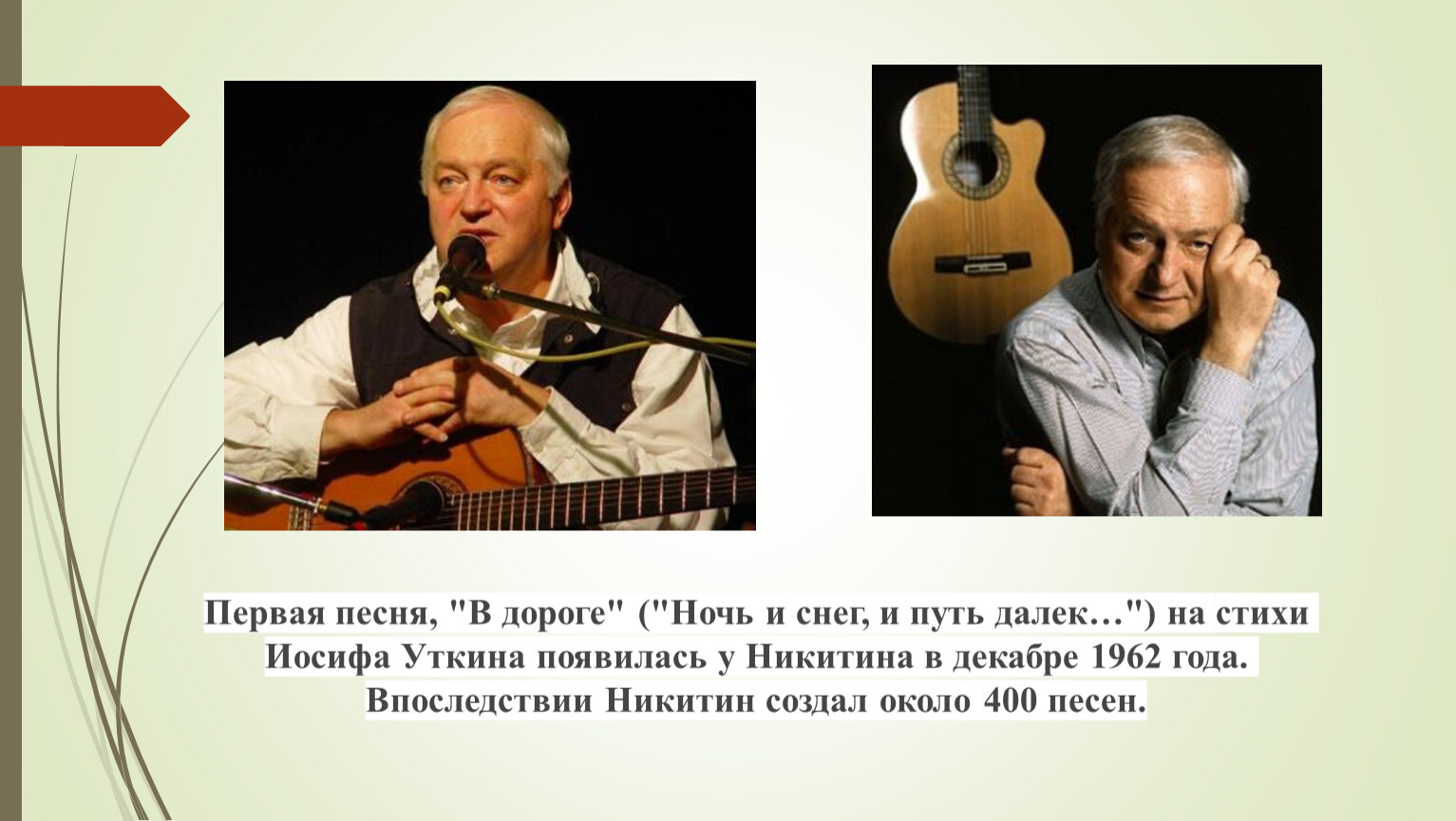 Первая песня, "В дороге" ("Ночь и снег, и путь далек…") на стихи Иосифа Уткина появилась у Никитина в декабре 1962 года. Впоследствии Никитин создал около 400 песен.