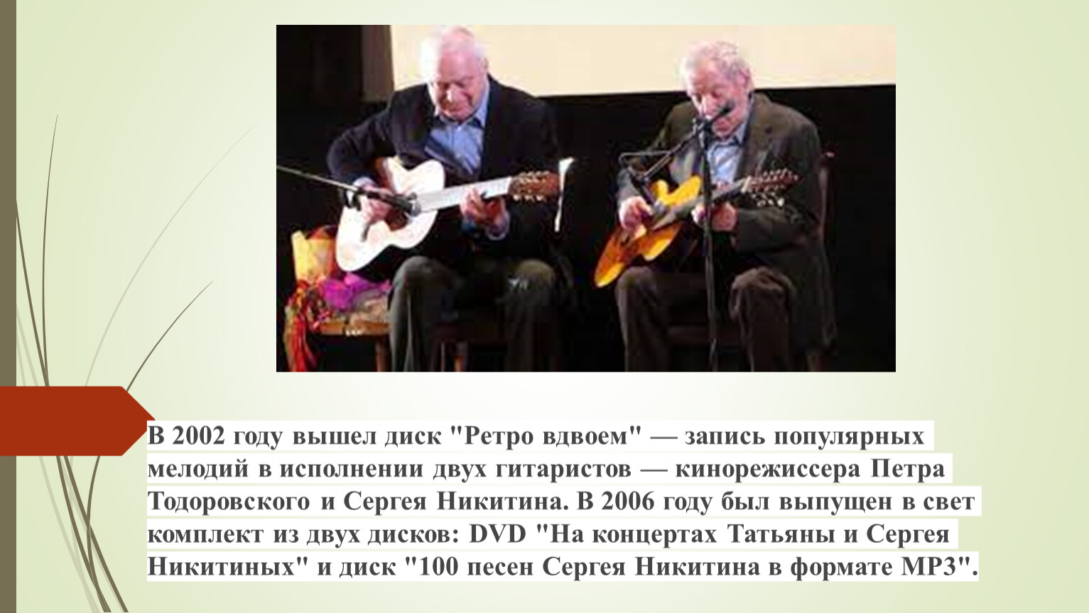 В 2002 году вышел диск "Ретро вдвоем" — запись популярных мелодий в исполнении двух гитаристов — кинорежиссера Петра Тодоровского и Сергея Никитина. В 2006 году был выпущен в свет комплект из двух дисков: DVD "На концертах Татьяны и Сергея Никитиных" и диск "100 песен Сергея Никитина в формате MP3".