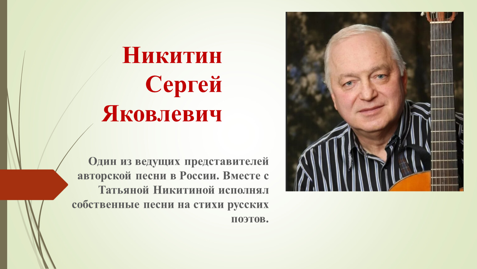 Один из ведущих представителей авторской песни в России. Вместе с Татьяной Никитиной исполнял собственные песни на стихи русских поэтов.